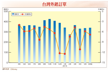 目前經濟部預估六月台灣外銷訂單金額介於三三八~三四三億美元,較去年同期衰退約六~七%之間,將進入第十五個月的衰退期。累計上半年大約年衰退八%左右,經濟部預估外銷訂單最快要到八月才可見到正成長的好消息,原因無他,是基期