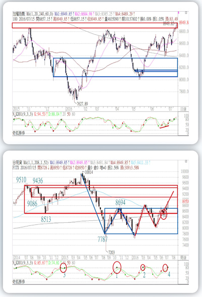 遵箱波均控盤戰法 積小勝為大勝若可以藉由一套賺多賠少的技術分析系統,依照紀律與訊號進出,經過長期的學習與薰陶,熄滅貪嗔癡,勤修戒定慧,漸漸地就能成為股市的常勝軍。藉由學習箱波均控盤戰法,可規劃接下來可能的走勢,如何移動停利,保持戰果,如何在不同週期與不同級數中尋找獲利的可能目標價以及風險較大的危險區。最後,藉由資金控管以及試單與加碼的技巧,以達到賺多賠少的目標。只要經過適度的調整操作心態與操作模式,就能有機會成為贏家,積小勝為大勝,每次的小勝都難能可貴,所謂聚沙成塔,不要小看複利的威力。我們再度來檢視現在的加權指數,從之前提及有日線KD底部背離+過而不破八三六三會有軋空行情,果然現在日線的KD已經在八十之上的軋空位階,在此之上就是短線軋空走勢,不需要預設立場,尤其ma1的向上波動根本就沒有出現回檔箱重疊的跡象,依照箱波均的招式:乖離過大要抱牢。再從加權指數的周線圖來看,周KD指標來到八十的軋空位階,順利向上轉浪,接下來只要續漲則導引周KD指標維持在軋空位階,就會看到之前朝提及的目標九○八六~九一四五~九四三六進行挑戰。跟隨市場趨勢 才是王道贏家的思維是:市場給予的方向才是真的,自己預設的不一定是對的。跟隨市場給的趨勢才是王道,不需要跟自己的荷包過不去,積極正面的迎接機會,不需要抱怨任何人,機會是自己創造的。任何一個線圖的ma1向上波動要結束,一定是出現止漲缺口或上漲阻斷的訊號,因此日線沒有出現止漲缺口,是不可能高檔震盪的,日線若沒有出現上漲阻斷訊號,是不可能結束軋空走勢的。因此,周線圖還需要做一個回檔箱,之後無法過箱頂才會出現止漲缺口,所以這波行情可以持續到七月二十日台指結算,甚至到七月二十八日摩台結算。