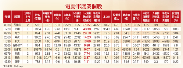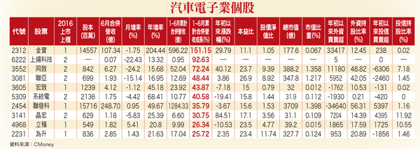 電動車市場成長快速 電池管理系統大廠台達電看俏根據經濟合作暨發展組織(OECD)、國際能源總署(IEA)於六月十二日發布之「國際電動汽車展望二○一六」報告顯示,全球電動汽車銷量在二○一五年底已達五十五萬輛,年增率高達七○%。 其中,純電動車(Battery Electric Vehicle, BEV)二○一五年銷售總量三二.八萬輛,插電式混合電動車(Plug-in Hybrid Electric Vehicle, PHEV)為二二.二萬輛。依照工研院IEK產經中心發布全球電動車市場規模預估報告指出,到二○二五年底,全球電動車市場規模將持續穩定成長達三一四一萬輛。電力設備及電池管理系統大廠台達電(2308),外資合計持股比重已高達六八%;近期股價表現亮眼,主因受惠電動車、綠能題材複合加持效應,上演一天即完成填息的亮麗表現。相較於去年共花了近三個半月才完成填息,今年急漲填息速度驚人。台達電旗下三大業務營收占比:電源及零組件五二%,能源管理二八%,智能綠生活一八%。特斯拉(TESLA)宣布正式在台灣成立分公司,雖然現階段主要銷售車種為Model S,不過法人認為,台達電已跟特斯拉建立穩定合作關係,一旦後續Model 3進入量產階段,台達電電動車充電系統可望正式供貨,大幅受惠。展望第三季,法人指出,台達電毛利率、營益率自第二季開始向上,第三季向來即為台達電傳統營運旺季,預估營收將可季增達一○%,主要為受惠被動元件(來自iPhone 7新機上市備貨熱潮)、電源管理系統業務成長力所帶動,EPS有機會突破二元成長至二.三元水準,季增三三%。近一年來可說是台股當紅炸子雞,的明日之星「汽車電子」,儘管近三個月相關族群個股股價先後回檔、乏善可陳,然整體產業長線展望,仍有機會在各國多項汽車安全相關政策上路的支撐下,持續拉高成長,例如美國立法要求汽車廠自今年起上市車款須配備CMOS影像感測器,二○一八年將擴及所有銷售車款,預估每年將創造一千五百萬套CMOS達七億美元以上商機,有利於台灣汽車安全相關電子族群營收獲利成長。根據市調機構iSuppli調查指出,全球相關汽車電子市場規模將會於二○二五年持續成長達二○○六億美元。各國汽車安全法規上路 倒車雷達大廠同致能見度高汽車電子車雷達大廠同致(3552),六月營收由五月份八.三億元下降為六.三億元,年增率僅有一五.六八%,為今年以來單月年增率成長幅度最低;累計前六月合併營收五二.○四億元,仍交出高達七二.二四%年增率佳績。同致前五大客戶,分別為中國江鈴汽車、長安汽車、長城汽車、上汽通用、三立通用等,占整體營收比重達五成以上。六月份長安汽車提貨量遠不如先前預期,其餘汽車廠也相繼見調整庫存,造成同致單月營收大減。不過,法人開始關注上汽通用近期銷量已見好轉,庫存相對低檔,七月份應有機會見到回補庫存,預料有機會為同致帶來支撐。八、九月營收展望,則以緩步回升看待。同致指出,客戶年度新車款多於第三季上市,如果九月新車款市場銷售反應不錯,第四季即可較樂觀看待。法人預估,同致第二季合併營收二二.八四億元,毛利率應有持平水準,EPS有望達三.五元;第三季營收預估有機會回升,第四季營運展望更佳。受惠全球汽車ADAS(先進輔助駕駛系統)相關配備市場滲透率穩定提升,同致產品需求暢旺,持續吸引國際品牌汽車廠下訂,今年營收獲利仍能維持原有高成長力;預料今年整體營收仍有望年成長約五成,EPS推估最高仍可達十八元;與去年九.三九元相比,持續維持高速成長步調。全球網路應用平台發展興盛 伺服器管理晶片市場擴大隨著全球電信及網路平台應用日益普遍,電信系統商、網路系統營運商也開始面臨網路流量管理技術、網通資訊的處理與運算穩定度重大考驗。隨著雲端系統、資料中心的大量建置,可便利網路人員監控網路系統正常運作功能的「伺服器遠端管理晶片」持續擴增,伺服器數量跟著不斷增加。根據Technology Business Research市場調查報告資訊指出,包含伺服器遠端管理晶片在內,全球雲端運算及大數據應用相關軟硬體市場規模將進一步於二○一八年持續成長達一一二○億美元。伺服器遠端管理晶片大廠信驊(5274),雖然六月合併營收○.九一億元,月減一四.四八%,業績滑落,寫下今年次低紀錄,年增率仍達二六.七四%;累計一至六月營收五.八九億元,年增三一.二一%。