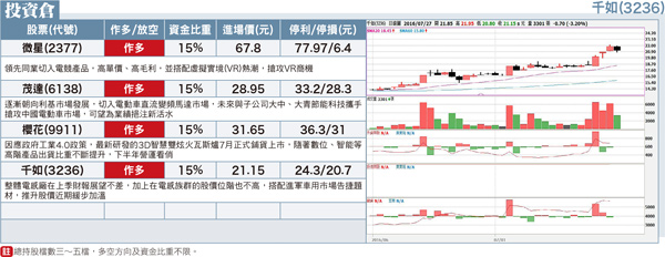 千如(3236)整體電感廠在上季財報展望不差,加上在電感族群的股價位階也不高,搭配進軍車用市場告捷題材,推升該股近期緩步加溫。千如已連四季獲利,第一季稅後純益達二千四百萬元,EPS達○.三九元。由於第二季合併營收達五.二億元,創二○一二年第三季以來新高紀錄,季增率達一一%,累計上半年合併營收年增一二.四%,營運持續轉佳。櫻花(9911)最新研發的3D智慧雙炫火瓦斯爐七月正式鋪貨上市,隨著高階產品出貨比重不斷提升,下半年營運看俏。大陸地區在通路結構調整後,第一季獲利大幅成長,展望今年兩岸獲利將同步提升,加上智能產品與減資題材,預期全年合併營收看增一○%以上,每股稅後純益挑戰三元,可望雙創歷史新高。微星(2377)主要產品有主機板、伺服器、消費性電子產品、及筆記型電腦等。領先國內同業切入電競產品領域,高單價、高毛利,今年持續提升比重,並搭配虛擬實境(VR)熱潮,於春電展祭出多款適用VR頭戴顯示器的高效能筆電,搶攻VR商機。