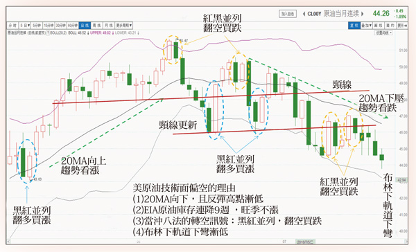 可能的因素有:(一)美國汽油庫存在暑假的旅遊旺季出現增加;(二)美國每週新增鑽油平台開工數開始增長,推測市場可能擔心在夏季用油旺季時出現利多不漲的訊號。美原油波段多轉空 美元指數強勢且油價再碰觸到五十美元整數關卡之後,跌破今年從二十六.○五美元低點起漲以來的上升趨勢線支撐,技術面在跌破四十六美元之後有盤頭的疑慮,因此才會出現「原油庫存減少,油價卻下跌」的走勢。剖析美原油的日K線圖發現,從五月十日以來,美原油的短線轉折都以當沖八法的「黑紅並列,翻多買漲」或是「紅黑並列,翻空買跌」的組合頻繁出現(見附圖),例如五月十日、六月十七日及二十八日等的「黑紅並列,翻多買漲」的買訊,或是六月九日、七月十三日及十八日等的「紅黑並列,翻空買跌」,果然造成二十日均價的由上漲轉為下跌趨勢。金價出現當沖八法轉折向下訊號:上影紅K,風中殘燭更重要的是,連帶拖累布林軌道整個往下移動,明顯的波段由多轉空的證據,因此從美原油的弱勢,可反推美元指數的強勢,更可進一步揣測市場傾向美聯儲就算按兵不動,美元指數還是要相對其他貨幣強勢。從這個角度順帶一提,近期的人民幣貶值走勢明顯,突破六.七元兌一美元關卡後,下一道較具參考的壓力落在六.九元,所以不排除今年人民幣有機會重見七元關卡。再來看國際黃金,從七月七日的一三七七.五美元高點拉回整理,這段期間都沒有出現過當沖八法的轉折訊號,而且七月二十日用長黑K跌破二十日均價支撐後,在二十一、二十二日的反彈過程中,竟然出現受制於二十日均價的遇壓徵兆,頗令人擔心國際黃金是否就在六月二十四日的英退歐議題引發金融市場恐慌後的利多大漲之後,就把今年後面可能發生的金融市場的黑天鵝事件的影響性,都反應進去了?!如果真的領先反應未來的十月義大利銀行壞帳的脫歐公投,與十一月的美國總統大選─川普變數,那麼六月二十四日那天的「上影紅K,風中殘燭」的當沖八法的轉折向下訊號,就很值得深思。筆者在金融市場二十年的歲月裡,深深體驗到「二八法則」的可貴之處,也才懂得為什麼主力莊家總是以對作為操作心法,因為唯有「逆向思考,順勢操作」,才是金融操作的贏家不二法門。