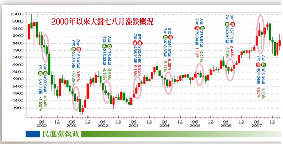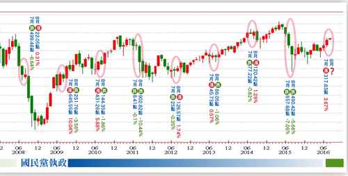 台股歷經近十六年三次政黨輪替,七、八月連漲兩個月的只有二○○三年,而且是五、六、七、八連漲四個月的「大四喜」,至於二○○七年則是在一路攻突破五窮六絕七上吊的魔咒後,高檔劇烈震盪八月留下長下影線收黑。今年難得在資金行情簇擁下,五、六、七連漲三個月,如今大盤在九千點水位震盪,究竟會走二○○三的大四喜模式,還是循二○○七年震盪收黑的走勢,外資是否持續加碼,動見觀瞻。以指數水位來看台股高踞九千點,與二○○七年指數位置相似,二○○七年走勢值得參考,如以融資水位來看維持率偏高,但還沒有到危險位置,散戶觀望者眾,台股籌碼並不亂,而以歷史經驗看來,大盤月線連漲三個月之後一定還有高點。台股除息延續資金行情 八月樂觀以待謹慎操作資金行情大體上與經濟數據關聯度小,在尚未出現明確結束訊號之前,也不必畫地自限。七~八月屬於台股除權息旺季,在資金滿溢的簇擁下,越早除權息則對填權息越有利,台積電、台達電都是典型的例子。據資料統計,近十年七~八月走勢相反的機率高達八成,而八月起除權息家數逐漸步出高峰,投資人對除息行情可以樂觀以待,但執行上仍須謹慎操作。如果除息前領先上漲幅度不小(視為領先填息),則除息後行情不必過於期待。觀察近十年台股七月與八月走勢,僅有二○一一年及二○一五年呈現齊跌,其餘八年盤勢都是七月漲八月就跌,或是七月跌八月漲的反向走勢,雖然過去發生的事,不必然重複演出,但還是提供投資人參考。從整體盤勢看來,外資還沒有立即撤出台股的跡象,就算八月適度拉回休息,反而有助長線指數良性墊高。而持續觀注全球資金移動的趨勢,以及美國聯準會升息的動向與美股的榮枯,仍是操作台股持盈保泰的必做功課。