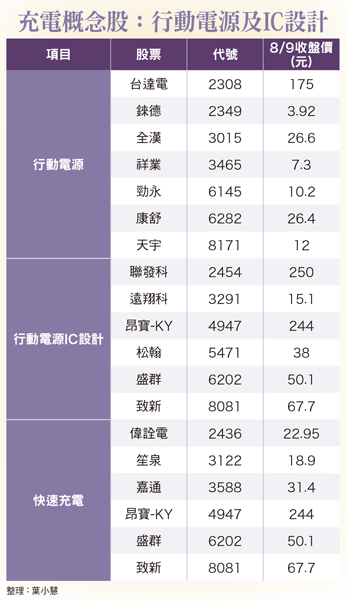 擴充實境(AR)智慧手機遊戲「精靈寶可夢GO(Pokemon GO)」八月六日正式在台開放下載,全民瘋抓寶,網路量暴增之外,耗電量同樣驚人,「充電」概念發酵,除了行動電源銷量迅速攀升,快速充電與無線充電題材再受矚目。行動電源直接受惠精靈寶可夢GO這款手機遊戲,必須持續開啟相機、全球衛星定位(GPS)、網路連線與動作感測器功能,每個小時消耗的手機電力高達三○%。以一支iPhone 6S手機來說,未開啟省電模式,三個多小時電力就會用盡,如果使用AR模式,電力將會消耗得更快。換句話說,若要抓寶一整天,玩家的手機至少需要重複充電五到六次,因此不少玩家湧進百貨公司或購物中心充電、連網。不過,遠離鬧區的公園綠地也是精靈寶們熱門出沒地點,帶動能隨身補給電力的行動電源需求暴增。市場研究機構NPD Group統計指出,美國的行動電源在今年七月十日至二十三日兩週間售出近一二○萬個,比去年同期成長了一○一%,可能與精靈寶可夢GO手機遊戲的熱潮有關。而在台灣開放後,據PChome 24h購物統計,八月六日到七日的行動電源銷量,較開放前的八月四日到五日成長二成。另外,樂天市場統計顯示,Pokemon、寶可夢、神奇寶貝等關鍵字搜尋較上月大幅成長二倍,行動電源銷量暴增四成。續航力需求拉動大商機這股暴衝的熱潮,受到國外「玩膩」的消息影響,市場很快出現降溫反應。精靈寶可夢GO概念股八月八日成功扮演台股多方指標,八月九日多數出現拉回整理,例如行動電源IC設計股松翰(5471),八日股價登上波段高點三九.四五元,九日即拉回下挫至三八元。然而,即使精靈寶可夢GO熱潮不再,行動電源商機後市仍不看淡。物聯網趨勢中,智慧行動裝置硬體規格精益求精,從觸控螢幕、核心記憶體、高像素鏡頭、藍芽、衛星定位等,耗電速度更快更大;而軟體部分,手機應用程式更為多元,例如消費者依賴臉書等網路社群與LINE等手機通訊軟體,都加深了提高續航力的充電需求。根據NPD Group調查統計指出,截至今年六月底,亦即精靈寶可夢GO登陸美國前,美國的行動電源年度銷售量比前一年增加三五%,顯示今年行動電源需求已比往年強大。知名市場研究調查機構Transparency Market Research(TMR)研究報告指出,隨行動裝置的普及,行動電源需求不斷成長,預計到二○二二年,全球行動電源市場將超過三六一億美元,二○一四至二○二二年期間年複合成長率高達二五.九%。TMR報告中指出,行動裝置的普及是行動電源需求快速成長的主要原因。此外,隨著行動電源技術不斷創新、功能不斷改進,寬頻和無線服務的發展以及不斷上升的安全標準,也是行動電源得以快速發展的重要因素。從電池類型來看,行動電源分為鋰聚合物和鋰離子電池兩種。其中,鋰離子電池的市場占有率接近八六%,占絕對的主導地位。在歐美等地區,考量安全、輕型、體積小的特點,鋰聚合物行動電源的需求量成長速度超過鋰離子行動電池。隨著智慧型手機流行、普及率快速上升,行動電源在配件市場快速發展,但行動電源技術門檻不高,許多業者搶進,長期惡性競爭下,終端產品價格快速下跌、產品嚴重同質化、假冒的劣質產品氾濫。行動電源爆炸的安全問題一度成為焦點,各國政府前兩年陸續祭出強制標準進行規範後,產品與市場情況逐步好轉。從企業來看,日立萬盛、Mophie、Limefuel、Anker、索尼、松下電器和三星電子為全球市場較矚目的行動電源供應商。眾多台廠投入行動電源終端產品,如台達電(2308)、勁永(6145)、錸德(2349)、全漢(3015)、天宇(8171)、祥業(3465)等,推出的產品種類琳琅滿目,競爭相當激烈,從而對營收及獲利貢獻不高。法人認為,在技術上擁有相對優勢的行動電源IC設計業者,在行動電源需求熱潮中,受惠程度相對大得多,如盛群(6202)、遠翔科(3291)、昂寶-KY(4947)、松翰(5471)、立錡(6286)、致新(8081),成為近期最受市場矚目的Pokemon GO概念股。快速充電技術成新趨勢行動電源市場熱度升高,快速充電、無線充電兩項充電新技術再成話題。法人指出,快速充電與無線充電一直是市場看好的充電新技術,但技術規格遲遲無法統一,阻礙了普及化的速度。快速充電原理是在電池容量不變情況,輸出功率愈大,充電速度就愈快,實現方式可以透過電流不變、提升電壓,或電壓不變、提高電流,或是電壓、電流同步提高,主要目的是縮短行動裝置的充電時間,避免使用者得等上大半天。無線充電技術的主要目的不同。無線充電主要配合需要防水、防汗的行動穿戴裝置,省去電源插座、多條電線纏繞的麻煩。行動穿戴裝置市場熱度影響無線充電技術的發展,蘋果Apple Watch叫好不叫座,從行動電源切入無線充電的盛群,日前法說會即透露,原本看好今年放量的無線充電市場不如預期。法人指出,無線充電技術的應用速度,要看穿戴裝置與電動車產品能否加速普及而定。至於快速充電技術,因為能大幅縮短充電時間,對手機用戶實質效益較大,普及速度可望較快。