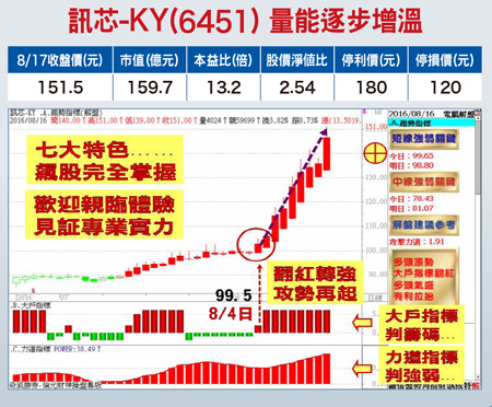 訊芯-KY(6451)系統模組之整合封裝測試技術具高度進入障礙,能達到輕薄短小的高階封裝技術研究,iPhone中有九個SiP模組,就有五個RF/PA是由訊芯封裝。主要利基有:(1)第二季業績超亮眼:受惠中、韓客戶智慧型手機拉貨力道增強、環境光源感測器封測訂單暢旺,以及高毛利高端SiP產品模組比重攀升,雖然第二季合併營收十一.六六億元,季增一九.九%,年減一三.三一%,唯毛利率達三一.六四%,營益率二二.○三%,均大大優於首季及去年第二季。不畏匯損影響,在本業獲利顯著提升下,第二季稅後淨利三.二七億元,季增達五一.九四%,年增達七五.八六%,EPS三.一一元,優於首季二.○四元及去年第二季的一.七七元,也優於法人預期,上半年EPS五.一五元,亦優於去年同期的四.○六元。(2)第三季看旺,持續攻頂:第三季為傳統旺季,隨著美系智慧型手機新品系統級封裝拉貨動能增強,加上公司積極開發MEMS、感測器、光纖收發模組等產品設計,繼七月續繳出亮眼成績後,預計八、九月將可持續增溫,第三季可優於第二季,下半年亦可優於上半年。七月合併營收四.○八億元,月增一.三六%,年增三.六九%,稅後淨利○.九億元,年增二○%,EPS○.八六元,吸引投信法人連七日買進(基本面資料若有異動,依公開資訊觀測站最新訊息為主)。
