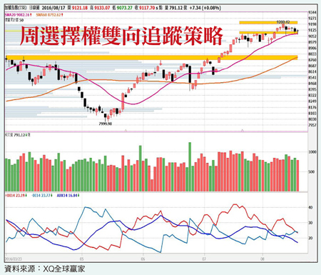 國際油價自八月初以來便自四十美元/桶的支撐水位反彈,走勢上呈現V型反轉,由於上周美國零售數據的表現,並不如市場預期要來的強勁,造成美元短線上呈現弱勢的表現,因此推升大宗商品價格趁機反彈。加上沙烏地阿拉伯近期再度展開行動,先是與俄羅斯在維也納商談油市議題,接著更表態,下個月將與非OPEC成員國再次商討凍產協議,企圖穩定國際油價。中國國務院批准深港通實施方案,陸港股再度成為市場萬眾矚目的焦點,市場普遍預期即將於今年底十二月正式起動,由於二○一四年滬港通上線後,滬港兩市的多頭行情仍令投資人印象深刻,因此,這次的深港通確實令市場有所期待,而同樣位在亞洲新興市場的台股,目前相對於深證指數基期偏高,勢必將受到資金排擠效應的影響。八月份台指期結算在九一二一點,可以說是撐高結算,外資期貨當日淨多單僅下降兩千多口,目前依然維持在六萬六千八百六十六口的極高水位,另一方面,八月份新加玻摩台指的未平倉水位,目前已來到二十一萬口的高檔水位,顯然外資對台股後勢依舊樂觀,但由於台股近期波動降低,若國際市場無大波動的話,下週預期仍將維持高檔震盪的走勢,周選可逢低布局溫漲(買權多頭價差)策略。