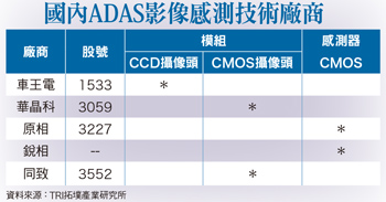 台廠營運催化劑 影像辨識商機大研究機構IC Insights指出,未來幾年自動駕駛汽車技術的發展,將促進汽車廠商為自家車輛產品導入更多CMOS影像感測器,預估CMOS影像感測器未來五年(至二○二○年)將以五五%的平均年複合成長率成長至二十二億美元。車用影像辨識系統的相關廠商,包括車王電(1533)、同致(3552)、華晶科(3059)、原相(3227)等。其中車王電包括CCD與CMOS攝像頭模組,同致、華晶科生產CMOS攝像頭模組,原相生產CMOS影像感測器。據指出,CCD影像感測器技術主要由日本廠商掌握,包括Sony、Sharp、Panasonic與Sanyo,而CMOS感測器國內則有原相、銳相、宜霖、泰視等,發展CMOS攝像模組的ADAS上較具有成本優勢。原相憑藉影像辨識發展經驗,切入成長迅速的車聯網領域,從主攻倒車感測器,到車道偏離警示感測、防撞警示感測等,目前已申請車道偏離警示系統感測專利,並開始投入自動計算車輛距離並提出警示或自動減速感測技術研發,預期今年下半年有機會卡位成功。ADAS成長動能可望成為原相長線營運催化劑。