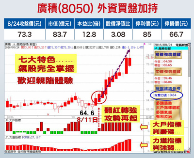 工業電腦領導廠廣積(8050),產品以板卡為主,其次為整機系統;博弈機台部分,主要透過子公司廣錠經營;車用電腦部分,主要透過子公司廣昌經營。主要利基題材有:(1)第二季EPS登峰,營運先蹲後跳:受惠產能利用率大增及產品組合優化帶動,第二季合併營收一三.一六億元,季增一八.四九%,年增二二.二八%,毛利率三七.七八%,營益率二○.三九%,均大幅優於去年同期的二八.四九%和八.一六%。雖仍有人民幣匯損及未分配盈餘稅攤提,但在本業獲利大幅成長下,稅後淨利及每股盈餘仍順勢改寫歷史新高,稅後淨利一.九二億元,季增一八.五九%,年增達二.一七倍,EPS一.八一元,優於首季的一.五三元及去年第二季的○.五六元,累計上半年EPS三.三四元,亦明顯優於去年同期的一.九一元。公司表示,未來成長力道除了來自於美國戶外PPC訂單的穩定安裝,日本市場也接獲不少PPC業務,此外,醫療平板確定第四季出貨,成為營運成長新動能,加上美國網通大廠Fortinet從三月起展開拉貨,能見度直達二○一八年,博弈子公司廣錠(6441)今年以來大型機台業務開始起飛,都是廣積今年營收獲利優於同業主因。(2)法人按讚,包括外資及元大投顧紛紛上修其今明兩年EPS目標值,同時給予買進評等(基本面資料若有異動,依公開資訊觀測站最新訊息為主)。
