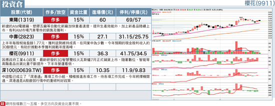 東陽(1319) 汽車零組件需求持續增溫,新產能與新訂單持續挹注,法人預估第三季淡季不淡,營收與獲利可望持續成長。今年上半年稅前盈餘十五.○二億元,每股稅前盈餘二.四三元,成長一一一%,創同期新高。今年獲利成長的重要來源在於新建的AM電鍍廠、塑膠五廠等自動化新廠加快量產速度,提升生產效能外,加上新產品陸續上市,有利AM市場汽車零件的銷售及獲利。中壽(2823) 上半年每股稅後盈餘一.七七元,獲利逆勢維持成長。根據內部的預估,今年預期的現金股利收入約三十餘億元,多數會在七、八月入帳,有助於推動本季獲利挑戰年度高峰。目前股價淨值比不到一倍,且以去年底每股隱含價值五十五元來看,股價隱含價值比還不到○.五倍,長期投資價值浮現。櫻花(9911) 最新研發的3D智慧雙炫火瓦斯爐七月正式鋪貨上市,隨著數位、智能等高階產品出貨比重不斷提升,下半年營運看俏。法人指出,櫻花大陸地區通路結構調整後,第一季獲利大幅成長,展望今年兩岸獲利將同步提升,加上智能產品與減資題材,預期全年合併營收看增十%以上,每股稅後純益(EPS)挑戰三元,可望雙創歷史新高。深100(00639.TW) 中證監已成立了「深港通」專項工作小組,積極推進各項工作。待各項工作完成後,今年將擇機開通,深港通是A股疲弱行情中的重磅利好政策。