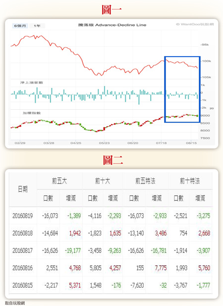 前幾天寫了一篇文章,提醒你說「高檔盤整本身就是風險比較高的盤勢,沿著月線往上走的盤,如果最近要操作就做短線,不然就等盤勢出現明顯修正再說吧。」目前看起來的確出現修正了,大盤跟台指期都跌破了月線(20MA),原本是多方優勢的點一一叛變到空方,我們一起看看有哪些要觀察的。騰落線、籌碼、強勢股 看出大盤走勢之前有提醒過你,雖然指數還在緩步盤漲,但是代表市場多空氣氛的騰落線已經提前下彎,週五那根破線黑K還沒出現以前就已經下彎了。騰落線下彎表示市場下跌的股票家數比上漲的家數多,假設大盤很快要大漲,但是大多數股票卻是下跌的,這件事不太合理,所以從騰落線來看,我們可以確認暫時是空頭佔優勢(請參考圖一)。第二我們來看籌碼,既然外資永遠是六萬多口的多單留倉,那我們就可以直接忽視掉,改成觀察前五大交易人跟特定法人的持倉變化。前五大交易人、前十大交易人、前五大特定法人、前十大特定法人都是留空單多,而且不是一兩千口,是一萬六千口的空單(請參考圖二)。但是一萬多口空單還沒有外資多單的四分之一耶,為什麼不看外資的大量多單,要看大額交易人的少量空單呢?