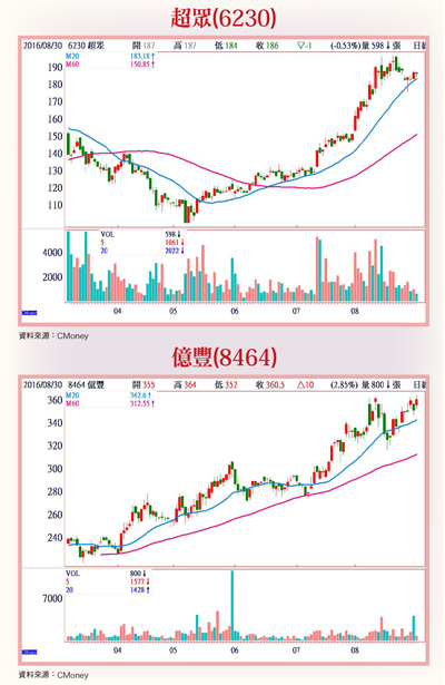 超眾Q3營收可望再創新高超眾(6230):散熱導管及模組大廠,公告七月營收五.八四億元,月減一.九一%,年增率持續成長達二一.八九%。累計一至七月合併營收四一.三三億元,年增二八.○三%。上半年營收三五.四八億元,毛利率二七.七九%,稅後純益四.九八億元,EPS五.七八元,較去年同期二.七○元倍數成長。受惠三星智慧型手機新品導入「微型熱導管」應用,推升超眾第一季稅後淨利創歷史次高。儘管手機客戶拉貨高峰已結束,因接續受惠「伺服器散熱模組」訂單挹注,四、五月合併營收均達標往年水準,雙雙達六億元以上。隨著「手機微型熱導管」需求進入旺季,占超眾整體營收比重有望拉升達一○%以上;另外,「電競散熱模組」也可望突出成為支撐PC、NB零組件供應鏈後市發展關鍵之一。下半年向為智慧型手機銷售旺季,預估第三季開始散熱模組購料需求明顯增溫。另一方面,出貨三星手機微型熱導管,因三星Galaxy Note 7熱銷,不只營收有望自八月起走高,預料也有機會獲其他手機廠跟風下訂;加上NB、伺服器旺季來臨,市場需求暢旺,都將推升第三季營收表現有望優於第二季,再創歷史新高。法人預估超眾今年整體營收有望較去年持續成長達三○%,EPS有機會站上十元大關。迎旺季 億豐今年再賺一個股本億豐(8464):百葉窗、窗簾大廠,公告七月營收一五.八一億元,月減四.八三%,年增六.四一%;累計前七月合併營收一○六.六七億元,年增一六.八六%。隨著下半年傳統旺季展開,營運也將開始持續走高,外資持股比例突破三○%,已達三四.三四%。法人指出,億豐受惠柬埔寨新廠產能加入營運,且持續擴充歐、日等新市場商機開發有成,原本預估第二季EPS上看二.七元以上,最後結算公布為三.五元,為近四季以來新高。法人指出,億豐目前正持續拉大高毛利率之客製化產品營收占比,由於客製化產品向來即與新屋成長率連動性不高,營運可較不受美國新屋開工率下滑影響,再加上持續擴增非美國市場營收貢獻,皆有助今年前景展望續樂觀。由於與歐美市場同業相較,億豐客製化產品具成本低、交期短優勢,近兩年順利維持二○%年複合成長率。展望後市,下半年為傳統旺季,營收有望逐季走高,獲利改寫紀錄機率高。法人預估億豐今年合併營收有望挑戰二百億元以上大關,年增率上看近二○%,稅後盈餘可望達三十億元以上,年增率將超越二○%,全年EPS有機會衝高達十一元以上,續賺一個股本。