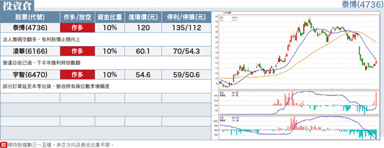 醫材廠泰博(4736)核心技術為電化學式檢測技術,主要產品包括居家醫療用血糖機及拋棄式血糖測試片,上半年營收比重分別為一九%及七三%。第二季受到負毛利率的血糖儀出貨大幅增加影響,產品組合轉差,獲利不如市場預期,加上七月血糖機出貨將近二十六萬台,創近兩年來單月新高,又開始提列新產品貴金屬電極試片設備的折舊,第三季獲利恐進一步衰退。因應新版國際認證規範測量準確度標準提高,準確度大幅優於傳統碳電極試片的金屬電極將會是未來的應用趨勢。泰博目前已投入逾四億元建立金屬電極產線,年產能約二千萬盒金屬電極測試片,新產線已於八月投產。另與江蘇魚躍合資成立鹽城華一醫用儀器公司,合作生產電子體溫計及額、耳溫槍等體溫量測產品,預計量產後可藉由規模經濟,大幅減低生產成本,使產品具有競爭力。泰博將負責銷售中國以外的OEM市場。今年為公司血糖機出貨量最佳的一年,雖產生毛利率、整體獲利下滑等負面效應,但以一盒五十片裝血糖試片推測最遲於四個月後消耗完畢,將有助明年高毛利率的血糖試片(六六%)出貨量大幅成長。觀察近期籌碼變化,投信在歷經一波停損賣壓後,已開始由賣轉買,外資調節也近尾聲,有利股價於年線附近開始築底,甚至有機會提前反映明年的獲利成長預期。