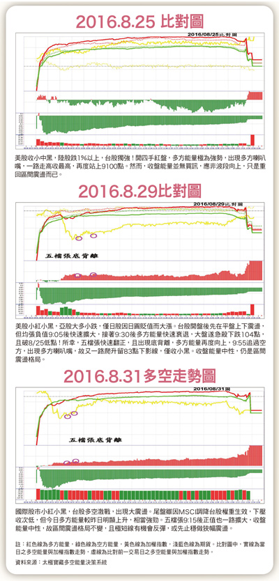 八月十九日台股一開盤就出現台幣大幅貶值超過兩角,多方能量明顯衰退的警訊,加權指數衝高下殺,日K線陰線吞噬。但次一營業日(八月二十二日)多方能量就快速回升,且收盤能量賣訊消失,表示警訊並未轉成危險訊號,台股也就開始反彈。八月二十三日台幣並未出現第三天續貶,反而升值將近一角,進一步確認台股仍屬高檔震盪格局。上周四(八月二十五日)國際股市鴉鴉烏,美股震盪走低收小中黑,陸股跌一%以上,台股卻獨強!開四手紅盤,多方能量極為強勁,出現多方喇叭嘴,一路走高收最高,再度站上九一○○點。然而,收盤能量並無買訊,表示並非波段向上,只是警訊消失,重回區間震盪而已。上周五(八月二十六日)加權指數在不到四十點範圍狹幅整理,量縮小紅,收盤只差三點就要收復八月十九日的中長黑K。但收盤能量卻重新出現短線賣訊,預告高點有限,又要拉回。本周一(八月二十九日)國際股市平穩,美股小紅小黑,亞股大多小跌,日股則因日圓貶值而大漲。台股開盤後先在平盤上下震盪,但均張負值九點零五分後快速擴大,接著九點三十分後多方能量快速衰退,大盤遂急殺下跌一○四點,且破八月二十五日低點!所幸,五檔張快速翻正,且出現底背離,多方能量再度向上,九點五十五分追過空方,出現多方喇叭嘴,故又一路爬升留八十三點下影線,僅收小黑。收盤能量中性,仍是區間震盪格局。周二(八月三十日)九月摩台結算,台股卻在四十點範圍狹幅整理,收盤也收在平盤附近。有趣的是,選擇權隱含波動率不但沒有因量縮盤整而收斂,反而買賣同增,因此我在媒體預告,次日必有大震盪!周三(八月三十一日)國際股市小紅小黑,台股果然出現大震盪。尾盤雖因MSCI調降台股權重生效,下壓收次低,但多方能量較前一天明顯上升,相當強勁。五檔張九點十五分後正值也一路擴大,收盤能量中性。故區間震盪格局不變,且極短線有機會反彈,或先止穩做狹幅震盪。