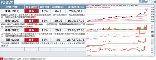 東陽(1319)今年上半年稅前盈餘十五.○二億元,每股稅前盈餘二.四三元,成長一一一%,創同期新高。今年獲利成長的重要來源在於新建的AM電鍍廠、塑膠五廠等自動化新廠加快量產速度,提升生產效能外,加上新產品陸續上市,有利AM市場汽車零件的銷售及獲利。崇友(4506)上半年合併營收為二十四.八七億元、稅後淨利三.九七億元、每股稅後盈餘二.○二元,皆創歷史同期新高記錄。一方面係因新梯出貨完工台數需求強勁,另一方面,受惠台灣電梯安全意識持續提升,使得汰舊換新電梯市場保持良好成長動能。中壽(2823)上半年每股稅後盈餘一.七七元,獲利逆勢維持成長,在同業中為少數。根據內部的預估,今年預期的現金股利收入約三十餘億元,多數會在七、八月入帳,有助於推動本季獲利挑戰年度高峰。目前股價淨值比不到一倍,且以去年底每股隱含價值五十五元來看,股價隱含價值比還不到○.五倍,長期投資價值浮現。岳豐(6220)今年上半年稅後盈餘達一億元,較去年同期大幅成長二.三三倍,每股盈餘為○.七七元,由於車用影音訊號線正式打入日系車廠,已開始交貨給車廠,「雷射聖誕燈」亦將於下半年開始大量出貨,隨著下半年進入傳統旺季,且美國經濟強勁成長,下半年獲利可望優於上半年,法人預估,第三季每股盈餘可望達一元。