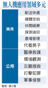 美國交通部聯邦航空管理局(FAA)無人機管理規範八月底正式生效,部分商用無人機無需送件審查就能使用,市場預期一年內將有六十萬架商用無人機在美國上空盤旋。外資麥格理針對此項鬆綁,點名建準、聯發科、雷虎、經緯航等廠商可望受惠。美國無人機規定鬆綁創商機二○一○年時,FAA曾經預言,到了二○二○年,美國無人機數量將達到一.五萬架,然而至今FAA已有一.九萬架商用無人機註冊紀錄,且無人機銷售量每月仍在成長。今年八月底最新生效的商用無人機升空規則,適用於五十五磅以下無人機,而無人機駕駛只要通過筆試及背景調查,不需要有飛行執照,就能取得駕駛執照,將有利無人機送貨。其他規則包括商用無人機必須在四百呎即一二二公尺以下空中飛行,限速每小時一百哩(一六○公里),並不得於晚上飛行,要求操作人員一次只能負責一架。FAA預計至二○二五年,無人機產業可望帶來十萬個工作與八二○億美元的商機。對於致力物流革命的亞馬遜(Amazon)或Google來說,美國這個新規範仍與發展預期有落差,可能拖延美國落實無人機送貨服務的時程。不過,對無人機產業而言,這項規定等於在美國商用化的一大步,仍是相當振奮的好消息。實際上,商用無人機除了亞馬遜提出的三十分鐘送貨服務,其他應用正多元發展,例如今年里約奧運的划船賽空拍、在阿富汗掃除地雷用的無人機,法國郵政署更打算利用無人機送報紙與郵件,也有單位正研究用無人機進行巡航或搜救任務。無論我們在何處,「打開門、看到無人機」那一刻的腳步逐漸逼近。