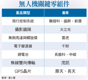 聯發科、建準、雷虎、經緯航搶市一架無人機需要的性能,包括飛行時間、載重限制、雷達偵測與閃避,乃至於視訊識別能力等,相應的關鍵零組件包括無刷馬達與螺旋槳、飛控系統、GPS晶片、無線雙向傳輸、鋰聚合物電池、電子變速器、視訊傳輸系統等,而這些都需要高度與龐大的運算能力。外資麥格理近期剖析全球無人機供應鏈,在台系概念股中首推聯發科(2454),同時也點名建準(2421)、雷虎(8033),以及今年八月八日甫於興櫃掛牌的經緯航(8495),並表示因商用無人機單位售價高、應用範圍廣,預期二○一八年將占無人機市場規模九成以上。聯發科在無線通訊與連接領域技術,已可應付無人機飛行控制系統所需。目前聯發科在無人機領域的營收占比仍低,不到一%,但市場看好未來無人機市場需求,可望成為這股潮流中的受惠者。同受外資點名的建準,目前主要切入中國無人機龍頭廠大疆的毫米風扇供應鏈,在客戶持續拉貨情況下,法人看好第三季月營收有望逐月成長。以玩具模型起家的雷虎科技,已成功轉型多軸飛行器,在空拍市場應用有相當口碑,尤以高轉速的無刷馬達最受好評。經緯航太則是專攻無人機載具完整解決方案,自二○一一年起開始陸續驗證無人機相關應用,目前已成為亞洲唯一垂直整合無人機載具研發生產、載具操作服務及資料分析等上中下游技術的加值型服務廠商,提供無人機載具完整解決方案。