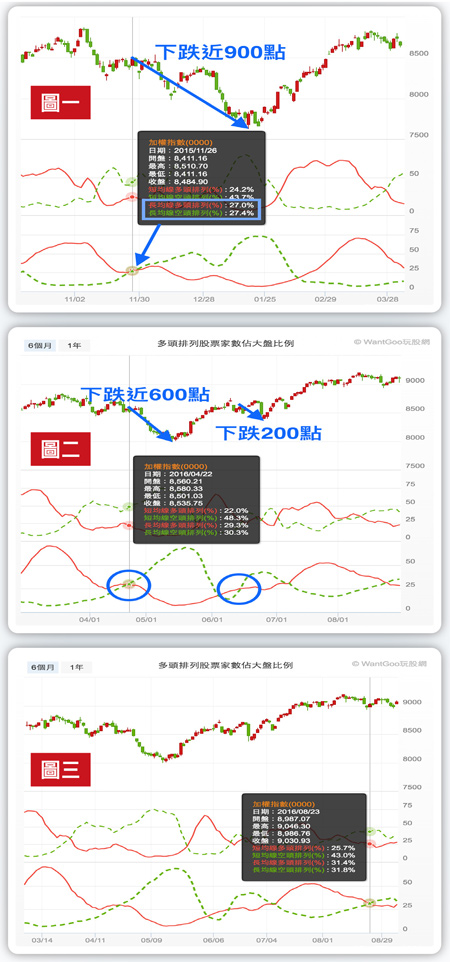 上禮拜的文章,跟讀者說最近台股出現一個很危險的訊號,這一年內出現這個訊號有三次,三次出現之後,下跌的機率是一○○%。那個數據是「股票多空頭排列家數佔大盤比率」,我們看長期均線多空頭排列家數變化,今年有個特性,只要是空頭排列家數佔大盤比率交叉突破多頭排列家數,後面都是下跌的。2015/11/26(見圖一)、2016/4/22和6/16分別都出現這種現象(見圖二),後來也分別跌了六百點跟二百點,現在8/23又發生一次這種現象(見圖三),你猜這次會怎麼走呢?多空指標辨別市場氣氛多頭排列其實我講過很多次了,其實就是越短期的均線在越上面,反之空頭排列就是越短期的均線在越下面,當盤面上越來越多股票走成多頭排列的時候,代表整個盤面越來越偏多,多頭排列的特性就是往上沒有壓力,往下有支撐,空頭排列剛好相反,就是上有壓力,下沒有支撐,越來越多股票出現空頭排列的時候,盤面就越來越偏空。你可以用這個數據來判斷現在整個台股市場的多空氣氛是偏向哪邊。