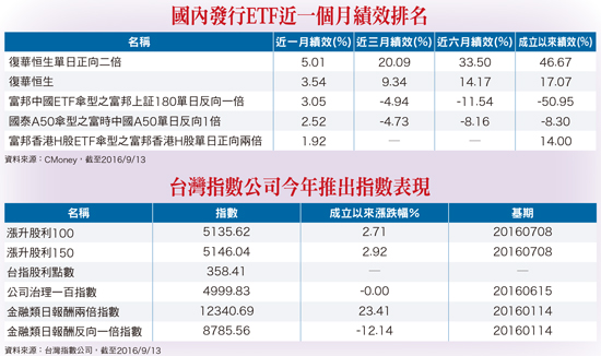 金融海嘯後,投資人對金融商品透明度及流動性需求提高,全球ETF發展日趨蓬勃,尤其在亞洲ETF已達九百檔,近五年市場規模平均每年成長二六%,高於歐美,台灣ETF資產規模更逼近三千億元,較去年成長近三成。金管會副主委黃天牧表示,主管機關對ETF的發展相當重視,在效率市場下,市場情況都會反映在股價上,相較於找專業經理人挑選最好的股票,投資與市場發展趨勢相關的指數比較適合。指數持續推出 績效表現亮眼台灣指數公司總經理李啟賢認為,指數化投資是全球發展的趨勢,退休基金管理也向其靠攏,全球指數化產品的投資規模超過三.三兆美元,台灣指數公司今年三月正式營運以來,陸續發布漲升股利一百、一百五十和台指股利點數,和完成金融槓反指數、台灣加權槓反指數、及公司治理一百指數授權投信業者,打破二○一四年以來只新增追蹤海外指數ETF的局面。根據CMoney統計,八月各類型基金績效,以指數股票型-跨國投資表現最佳,整體績效表現四.○七%,其中香港地區近期漲勢驚人,惟九月來受升息情勢影響,國際股市波動,整體形成震盪收斂格局,中國反向避險ETF也隨之上漲。而今年發布的指數中,台灣公司治理一百指數及金融類日報酬兩倍指數表現較佳。台灣證券交易所副總經理黃乃寬指出,未來還會參考國外知名指數公司如恆生、S&P及MSCI指數編製方式,研擬Smart Beta策略商品,從傳統市值加權指數,演進至加入針對特定風險因子進行篩選的操作方式。他表示,使用Smart Beta策略,被動式投資績效更有機會能打敗大盤。國內發行ETF檔數共計五十三檔,以投資地區而言,台灣為大宗共十七檔,中國次之;以類型分,國內成分證券十三檔、國外十五檔,槓桿及反向型則有二十二檔。十月七日元大投信還將掛牌追蹤韓國KOSPI200指數的ETF,以及追蹤黃金、原油的槓反ETF,十月十七日國泰投信也預計發行台灣首檔追蹤美國道瓊工業指數的ETF。李啟賢表示,ETF已佔資本市場成交量近一成,相較二○一四年的一.八八%大幅成長,未來規劃結合目前政府重點發展的產業,與投信業者合作,發行相關產業的指數,達成金融支持產業的願景。