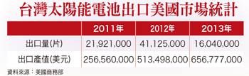 外銷美國市場太陽能 發展前景不樂觀台灣的太陽能產業,一度曾經於二○一○年登上產業輝煌的發展巔峰。隨著當時國際油價自二○○八年衝上每桶一四六美元歷史高價後,儘管後來曾一度大幅回檔、修正至每桶三十一美元,但隨後再度快速上漲衝高至每桶九十美元。因此營造出全球追潔淨、替代性能源的應用風潮及市場商機有利發展背景,台灣多家太陽能多晶矽原材料、電池面板、電池模組等生產製造、代工廠,幾乎大多數時候,工廠的產能都維持二十四小時滿載運轉狀態,公司可以說都同時獲得接不完的連續訂單,也都有或多或少被客戶追著跑、吵著要貨的難得「甜蜜」經驗。
