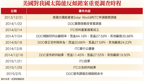 後來,台灣更因此成為全球的太陽能電池工廠,市場占有率排名第二,僅次於由政府補貼政策所大力扶植的中國太陽能產業競爭對手。二○一三年出口的太陽能電池,總發電量超過八三○萬千瓦,約等於三座核四規模。茂迪、昱晶、新日光等三家太陽能電池廠,營收排名全球前十大。然而,後來卻因為所謂的「樹大招風」,於二○一三年十二月底,遭美國太陽能業者Solar World向美國國際貿易委員會(ITC)申請,進行「我國、中國大陸輸美之晶矽太陽能產品是否對美國國內產業造成損害」調查。過後不久,依據美國商務部(DOC)實際調查結果,美國ITC於二○一四年二月十四日,作成對其境內太陽能產業已造成損害之初判。二月十四日,美國ITC受理德國太陽能業者Solar World提告,指控中國太陽能競爭對手有反補貼、反傾銷,台灣太陽能廠有反傾銷嫌疑,亦即市場人士所俗稱的「雙反」控告。七月二十六日,DOC調查結果出爐,台灣、中國皆遭判「有罪」。美方主管機關因此祭出高額反傾銷稅懲罰台灣太陽能業者。二○一三年台灣的太陽能產業龍頭廠茂迪,被課以高達四四.一八%的反傾銷稅率,排名第二的昱晶亦被課以二七.五九%稅率。其餘台灣太陽能廠商所遭課反傾銷稅率,則多落於兩者之間範圍。去(二○一五)年一月二十九日,ITC公告終判結果,二月五日發布命令開始執行課稅。鋼鐵業被課徵反傾銷稅 外銷北美市場前途茫茫台灣的鋼鐵產業,近幾年亦可說是與太陽能產業同病相憐、難兄難弟,同樣面臨了數次來自國外市場,當地政府所施行的課徵反傾銷稅重大阻礙、挑戰。台灣鋼鐵業者近幾年遭國外政府課徵反傾銷稅的案例,包括加拿大政府自二○一二年五月開始,對台灣出口至當地的焊接碳鋼管產品展開反傾銷調查,同年十二月開始,對進口台廠實施反傾銷課稅規定。根據經濟部國貿局所公布市場統計數據指出,於二○一二年前,二○一一年台灣鋼鐵業者對加拿大所出口焊接碳鋼管總金額高達一千九百萬美元;但實施反傾銷課稅後一年,出口金額只剩下一千一百萬美元。到了二○一三年時,僅只剩下五百萬美元左右,清楚顯示出加拿大政府對台灣實施焊接碳鋼管反傾銷課徵案之後,因此對於台灣出口廠商營收表現的影響、衝擊程度有多巨大。同時,經濟部於今年七月二十一日對外公告,美國商務部於五月二十五日原本所公告,自台灣進口的抗腐蝕性鋼品反傾銷終判課徵稅率為三.七七%,但七月十九日卻又跟著發布「疏失備忘錄」(Ministerial Error Memorandum),重新計算課徵稅率後訂定為一○.三四%,因此造成相關台灣廠商包括:燁輝(2023)、大成鋼(2027)、裕鐵、欣建工業等所生產產品,後市出口美國市場時,均將因此大受影響,也因而增加台灣業者接下來市場開發與經營成本,不利於美國市場銷售與市占率競爭。經濟部資料指出,在美國先前所公告反補貼稅率判決書中曾提及,台灣為全體受商務部調查的五個被指控反傾銷國家中,唯一獲得初判裁定無補貼政策的國家。不過,後續因提案原告美國AK STEEL鋼鐵公司,對美國商務部提出「『傾銷差額』計算錯誤」的控訴案後,商務部因而重新計算,承認作業結果確實有誤,也因此更改了終判結果。之後台灣所被新課徵調高之反傾銷稅率一○.三四%,稅率介於南韓被課徵「雙反」稅負之九.九四%~四八.九九%區間。針對此次美國商務部所作出更新反傾銷稅課徵稅率一事,產業界人士指出,台灣業者後市將會向美國國際貿易法院(USCIT)提出司法複查申請。根據美國商務部統計資料指出,去(二○一五)年台灣抗腐蝕性鋼品出口至美國總金額約五.三億美元,較南韓的五.一億美元略高一些,亦較中國大陸出口金額五億美元為高。