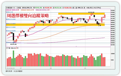美、日兩大央行利率會議同台演出,在此期間國際股市普遍呈現震盪整理的走勢,觀望氣氛濃厚,由於近期美國公布的經濟數據好壞參半,加上聯準會官員彼此之間對於升息與否的立場仍存在衝突。因此,普遍預期九月份升息機率偏低,市場的焦點仍將放在政策聲明以及聯準會主席葉倫的記者發表會,同時利率決議將於台北時間週四凌晨兩點公布。中秋連假期間iPhone7的上市,為台股帶來新的活水,由於預購熱潮遠遠超出市場預期,帶動相關供應鏈股價全面走強,台積電截至目前為止本周已上漲六.○五%,加權指數也出現久違的千億多頭行情,一掃連假前的弱勢,指數也重新來到八、九月份的箱型區間上緣,準備挑戰密集區壓力。台指期外資未平倉淨多單七萬四千六百九十七口,外資多單連續減碼立場轉向保守,自營商在選擇權則是偏多留倉,內外資立場開始出現衝突。不過,一旦市場確認美元不升息,在iPhone7題材帶動下,短線台股仍有上漲空間,可佈局溫漲(買權多頭價差)策略。