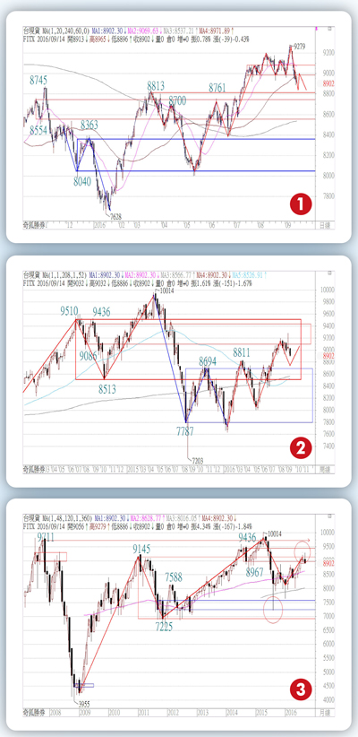以收盤價為多空交戰完畢關鍵點最懂得怎樣輸得少的輸家,才能成為最後的長期贏家。持續做對的事情,財富如影隨形。江湖一點訣,就差這一點。怎麼說呢?您看幸福的「幸」和辛苦的「辛」這兩個字,是否「幸」比「辛」多那「一」點,所以操作就順利了!當您比別人少那一點訣,操作就辛苦多一點。這次大盤快速地往上拉三根長紅,在一般市面書籍稱之為「紅三兵」,是強烈的買進訊號,但是若出現在末段,反而是強烈的賣出訊號。這就是酒田K棒在不同位階時經常會出現的問題與盲點,若無法確認不同位階有不同的解讀,使用酒田K棒就會經常被巴。箱波均控盤戰法是利用收盤價為多空交戰完畢的關鍵點,利用點形成向上波動或向下波動,利用畫箱待缺口來操作一段波動結束的行情。先看台現貨的日線圖(圖一),日線直接摜破8988,已形成上漲阻斷的走勢,若再出現破而不過8988,就會出現直接多殺多,縱使反彈不過上漲次箱頂9132,還是要往下測試8745。由於8554~8745是之前重回多頭的關鍵,這次回測不破8745,多頭還能樂觀,若回測不破8554,則多頭開始出現敗筆。由於這次是季線一段回檔的修正行情,因此年線ma240是測試的目標。十月收不過9086 小心大修正行情之前提及九月是災難月,務必要提早警覺小心應對,果然出現一段快速的拉回。接著看台現貨的周線(圖二),由於9086收不上,則有回測8694~8513的危機,8811一旦撐不住,往下還有約三百點的危機。讀者需了解,九月止跌反彈之後,若十月收不過9086則會出現季線的止漲缺口,也就要小心年底到明年的一波大修正行情。由於這次的行情級數非常非常大,投資人需逢高先減碼觀望,以免財富被修正。繼續看台現貨的月線(圖三),從3955上漲以來的紅色向上波動,若出現止漲缺口,而且又在9145這個地方收不過,就有機會往箱底7225做測試的危機。也就是說縱使過了9145,往上的目標頂多9436~9624,但是過不了9145往下的目標可以往7225測試,也就是說往上三百至五百點,往下至少是二千點的行情,因此觀望和逢高止漲避險是比較好的選擇。