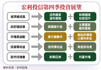 網路、汽車電子題材夯 A股後勢值得期待中國在歷經年初的動盪後,近期表現漸趨平穩,宏利精選中華基金經理人游清翔認為,中國第三季GDP增速將放緩至六.五%,第四季GDP則將與第三季持平;目前市場普遍認為經濟增長下行壓力還在,所以貨幣政策也會繼續放鬆,展望下半年,企業獲利增速可望逐季回升,整體消費仍維持在一定增速,因此大幅降低中國景氣硬著陸的疑慮,貨幣維持寬鬆,財政支出將持續穩住經濟基本盤,指數仍存在向上空間。除此之外,游清翔指出,大中華市場吸引人的地方在於中國經濟結構正處於轉型期,在轉型的過程相對容易找到新投資主軸,在相同的投資主軸中亦可在不同市場找到相對較好的投資標的,他看好網路相關需求以及汽車ADAS相關應用的崛起,相關題材的類股將受惠。亞債、點心債收益穩健 基本面強勁後市走多雖然聯準會暫緩升息,不過美元持續走強仍然是不變的事實,宏利亞太入息債券基金經理人王建欽表示,目前亞債市場已充分反映聯準會今年升息預期,在第四季美元將持續強勢的預期下,面臨全球經濟成長趨緩的環境,王建欽認為在亞洲仍具有強勁基本面的情況下,下一季度亞債仍有具潛力的投資機會。此外,宏利中國點心高收益債券基金經理人陳培倫也指出,點心債券擁有較高殖利率、供給減少、流動性寬鬆及整體信用風險低等優勢,鑒於中國經濟基本面仍然疲弱,加上通膨維持低檔,中國政府有意維持一定經濟成長的情況下,央行仍持續透過公開市場操作注入資金,寬鬆環境可望持續支撐債市表現。匯改周年後,十月一日人民幣納入國際貨幣基金組織特別提款權(SDR)生效,預期中國官方仍將保持匯率平穩,點心債可望維持多頭走勢。