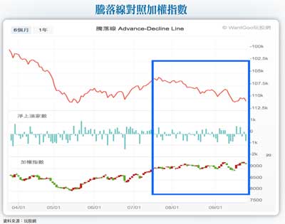 用騰落指標觀察漲跌家數我想這個疑問應該很多人都會有,看一下最近的騰落線跟大盤對照圖, 就知道從七月多,雖然指數是盤整往上,但是其實騰落線是緩步下滑的,也就是說最近幾乎都是權值股在漲而已,其他股票跌多漲少。通常發生這種背離的狀況(指數漲,但大多數股票跌)時,後來十之八九都是下跌居多,因為大多主力跟實戶其實是做中小型股票居多,只有外資法人在買超大型權值股,外資買滿手帶頭衝,衝了一陣子之後回頭一看發現後面完全沒人跟,他要把股票賣給誰?只有外資在玩 恐怕撐不久所以一般狀況是大行情需要法人跟主力跟散戶一起進場玩,只有外資法人自己是玩不久的,而且就算指數一直漲,外資拚了要買上去,但是除非你是買元大台灣50(0050),或是台積電,不然大多數股票其實根本沒在漲,甚至已經開始做頭下跌。但這是經驗法則,我只知道根據經驗,只要出現這種狀況,「之後」下跌機率比較高,但是我沒法知道這個「之後」什麼時候會來,記得二○一一年那時候也是這樣,指數一個月在盤整,甚至小漲一點點,但是在指數整理的時候騰落線已經開始下跌了,所以我當時就為文提醒讀者說要小心大跌,後來過了半個多月真的從九千點跌到六七○○點,指數跌了兩千多點,個別股票甚至跌掉四、五成。所以如果最近你要買台股,用短線的心態操作就好,不要下重注,停損要設好,別想說在九千多點長線投資,那太傻了。後續沒人敢保證 寧可空手等進場機會你如果不是長期看我文章的讀者,可能會質疑說我是不是死空頭,其實我不是,之前也有很多次在相對低檔提醒大家買點到了,只是現在對我來說是風險大於預期利潤,所以我寧願空手等更好進場機會。會不會需要等很久?不知道,在沒把握的時候我寧可多觀望。會不會不跌反漲?沒人敢保證,我只能跟你說之前發生這種背離現象的時候,後來盤勢跌很多,但是我沒法保證這次也一定會大跌,我只是把我觀察到的現象跟經驗跟你分享罷了。