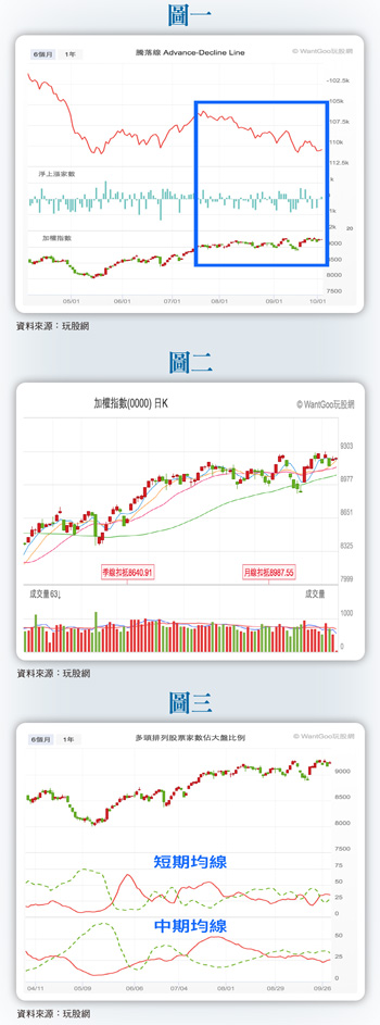 最近的台股已經快把大家逼死,壓縮到極至,不過也因為壓縮到極至,物極必反,代表即將要現出方向。指數上沖下洗兩面傷 買中小型股跌多漲少最近最慘的是做期貨波段程式交易的投機客,因為在盤整區間整理,所以時常是今天開低走低收最低,逼你空單留倉之後,隔天直接跳空開高走高,掃了停損之後再收低,不用多,一天搞個五十到八十點,連續弄兩個禮拜,非常痛;另外一個苦主是當沖帽客,因為在狹幅整理,每天區間很小,一天的上下震幅才五十到八十點,而且通常都只有一次機會,如果那一次上漲或下跌沒賺到,一整天都沒搞頭。另外一個苦主是操作個股,而不做指數的人,你可以看一下騰落線,這三個月以來都在高檔整理,指數慢慢漲,但是除了台積電、鴻海以外,大多數股票都是下跌的(沒錯,我想你也知道,台股很畸形的現象是只要台積電跟鴻海大漲,大盤就一定漲),另外一個現象,你注意觀察只要大盤沒有漲,騰落線一定下跌,大盤上漲,騰落線也不一定漲,所以單看騰落線是跌多漲少(見圖一)。但是如果你是操作指數的,不管是買元大台灣50,元大高股息,或是做單邊期貨,現階段單純看大盤的技術線圖(見圖二),其實是多方佔優勢的。