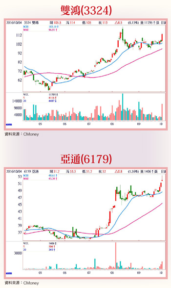 美國十一月八日總統大選,兩位候選人仍呈五五波拉鋸,國際股市近期恐仍不易見法人機構大規模進場。在台股多頭格局,持續相對低量未見明顯改變以前,勢必較有利於利基型、各擁利多題材中小型個股後續股價表現。本週理周投研部精選有望因傳統旺季來臨,營收成長動能轉強,產業基本面展望前景透明度拉高,吸引外資、投信搶進,拉高市場籌碼穩定度,股價有機會出現波段漲勢鏢股族群有:鴻碩(3092)、雙鴻(3324)、亞通(6179)、柏文(8462)等。鴻碩每股獲利可望翻倍成長鴻碩(3092):全球最大監視器用連接線廠,高度垂直整合綜效為其最大競爭優勢。八月營收二.六二億元,月增六.一三%,年增三○.五六%;一至八月累計合併營收一八.三四億元,年增二五.二七%。法人指出,由於物聯網需求持續升溫,帶動網通、車用電子連結器族群上半年營收獲利大幅飆升,較去年同期為優,產業發展持續看好,相關供應鏈有機會延續原本成長態勢。受惠面板出貨量成長力道轉強,間接拉升液晶監視器連接線出貨量,亦陸續接獲蘋果手機充電線及網通、車用電子連接線等訂單,鴻碩自農曆年後營收逐月走揚;也因為去年上半年營運獲利基期相當低,累計EPS僅○.○一元,成就了今年上半年營運獲利年增率高達一七九倍亮眼成績,累計EPS一.六元。鴻碩HDMI線材除已應用於電視之外,隨著網通、遊戲機、虛擬實境(VR)標配搭載HDMI 1.3、1.4線材比例大增,今年仍將持續爭取新客戶下單。預計後市來自蘋果副廠線材、HDMI等高階影音傳輸線材的訂單,將力拚達五成營收占比,預料可改善毛利率表現,法人預估鴻碩今年營收有機會交出二位數年增率,全年EPS有機會翻倍成長自三元起跳。