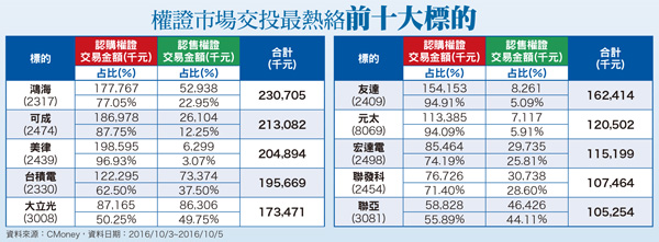 目前市場上權證日期計算大約可分為三種,一種以交易日為準,也就是每一個表定的交易日才算一天時間價值,但梅姬颱風這種忽然表外的放假也仍然算一天。第二種以日曆日為主,也就是日曆上的每一天都會減少一天的時間價值,如果持有的權證跨過周末,自然就少了兩天的時間價值。第三種則是混和制,兩天的周末可能會算一天的時間價值,平日還是以交易日為主。本周榜內最引人注目為美律(2439),梅姬颱風過後,宛如搭上觔斗雲般隨風飛揚,股價從九月二十九日最低一一六.五元漲至十月五日截稿前的收盤一三六.五元,漲幅達一七.一六%。八月營收來到十六.八億元新高,年增逾六○%,和前月增一三.三%,連三個月創新高。有抓住機會利用權證進場的投資人也享受到這段漲幅,看看美律兆豐63購02(050113),九月二十九日最低價為一.二,十月五日收盤二.○七,漲幅約七二.五%,槓桿效果大約四倍。近期加權指數區間整理,個股標的卻表現迥異,本周討論了時間價值的計算原則,善用權證低金額高槓桿特性,將成本控制在一定金額內來進出,較能穩紮穩打、持盈保泰。