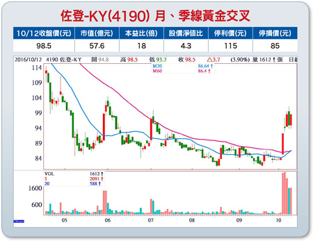 佐登-KY(4190)在嘉義大埔美工業園區興建全台最大的美妝品工廠今年九月動工,預計在二○一九年啟用,完工後將可以大幅提升產能,預計二○二○年可以將產能拉升至現在的十倍,以及新廠區也將設立觀光工廠,用以鎖定逐漸成長的嘉義觀光人潮的題材。公司目前在兩岸已有三十萬名的會員,中國市場的展店策略,由過去以加盟為主轉為直營店,截至九月三十日止,直營店已新增三十家,其中中國直營店就超過二十家並持續在擴點展店中。台灣的美妝概念館繼台中後,台北館已於十月進駐台北車站誠品商場,高雄的據點正在洽談中,今年底有機會敲定。佐登-KY九月起推出二十八周年慶活動,婦衡及腸道課程大受歡迎,產品銷售也增溫,帶動九月營收衝至一.七四億,較八月大幅成長二四.三%,同時也較去年同期增加四.九三%,並創今年單月新高。第三季營收為四十五億,雖僅較第二季四十三.四億微增,不過在費用下滑、營業利益回升下,預估第三季EPS可提升至一.三到一.五元。