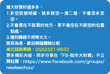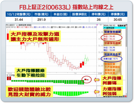 特別是隨著中國官方與財新製造業PMI從低檔同步回升,且連兩個月位於五十以上的擴張區間,根據過往跡象顯示,往往也能同步推升股市表現。同時,大陸國務院提出積極降低企業槓桿率,推動市場化債轉股,相關概念股上演爭相漲停;房市調控引發兆元級資金回流A股的預期升溫,以及節前新增投資者開戶量激增,激發市場作多熱情,在在有利於陸股展開一波反彈行情,市場也期待複製去年五百點大反彈機會(註:基本面資料若有異動,依公開資訊觀測站最新訊息為主)。操作建議:跌深就是最大的利多,只要能守穩三十.六五元關卡不破,逢低於十日線附近值得留意,或可參見「大財寶決策系統」之多空訊號來進行短線價差操作,基於風險考量,設好停損停利。