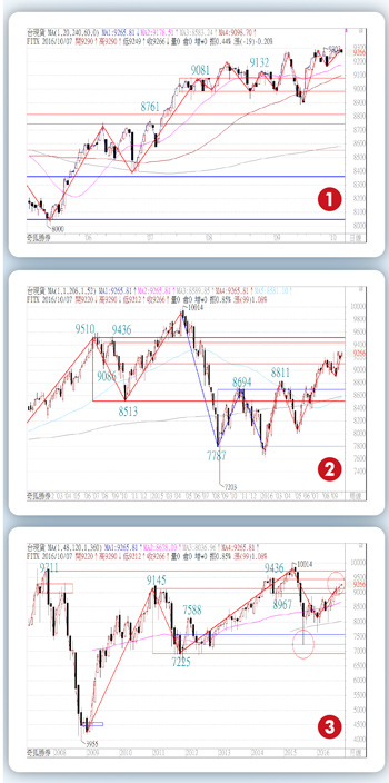 打個比方,ma5的扣抵這個動作就是「扣掉」五天前的收盤,用今天的收盤來「抵」,這就是扣抵的動作。簡言之,就是一加一減的意思,這一加一減的總和若是大於零,就意味著均線的方向是不會被扭轉的,若這一加一減的總和小於零,均線的方向就有走平往下的疑慮。然而,扣掉五天前的收盤這個數值就稱之為扣抵值,由於一天的扣抵值無法扭轉趨勢,我們常聽到趨勢不會被輕易扭轉,因此若看一段時間的扣抵值的連線位置,可以很輕易的研判這次的跌破均線到底是真跌破還是假跌破。為了方便看扣抵值未來幾天的走勢,把所有收盤價往右平移n天,就是n天的均線扣抵值曲線圖,為了讓讀者可以更直覺的知道現在的收盤離扣抵值多遠,到底是正的還是負的,我們就用一個扣抵值乖離來輔助研判。當扣抵值乖離呈現在零軸之上,意味著均線依然為助漲,若扣抵值乖離呈現在零軸之下,就意味著均線有機會被扭轉,即出現很簡單的紅買綠賣的波動控盤系統。當柱狀體縮小或接近零軸時,我們才需要盯盤,其餘時間都可以很輕鬆愜意的抱牢股票。多頭趨勢動力關鍵在九一六七來看台現貨的日線圖(圖一),其ma20和ma60已經離股價二百點以內,指數量縮高檔震盪,但仍守在九一三二~九○八一之上,最重要的多頭趨勢動力的關鍵是在九一六七,沒有出現破而不過之前,就是持續高檔震盪等待第三季財報公布。從這張圖可以看出多頭中線的趨勢動力關鍵在八九○二,沒有破而不過八九○二,大致上ma240還會持續往上移動。再看台現貨的周線圖(圖二),其五十二周均線和二○八均線應該下周就會出現黃金交叉,若指數沒有快速回檔,大致上多頭時間可以持續延續下去,目前八八一一~八六九四~八五一三都是多頭拉回的重要支撐帶,只要多頭趨勢動力依舊,理應往九五一○的九五至尊之路邁進。繼續看台現貨的月線圖(圖三),這張圖告訴我們,若回測不破九一五○再繼續向上波動,依照箱波均的理論,會往九四三六~九七一一挑戰。在九二○○之上股票操作難度越來越高,持盈保泰為主要策略。
