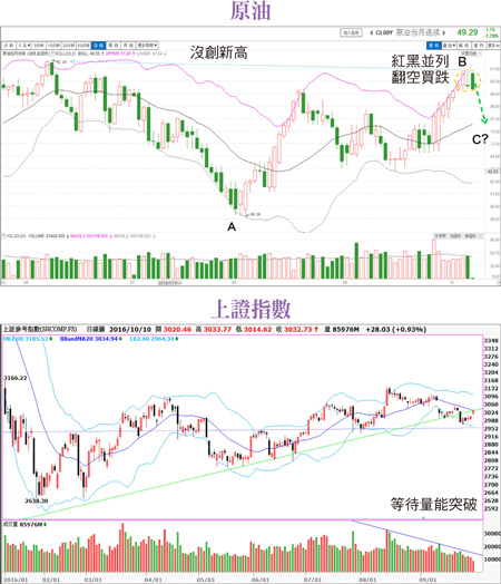 原油短線正乖離過大美國API原油庫存連續三周下滑,且EIA原油庫存更是出現連續五周的下降,造成十月三日至七日當周美原油上漲五.五九%,日K線圖的布林軌道被打開呈現擴張狀,與貴金屬的弱勢正好呈現強烈的對比走勢。不過,短線由於正乖離過大(對二十日均線的正乖離達九.九九%),造成十月七日的收盤出現當沖五絕的「紅黑並列,翻空買跌」的轉折翻空訊號,由於轉折訊號出現的位置正好是前波五一.六七高點的附近(沒創新高),自然造成市場擔心是否為第五波失敗波的走勢?又或者從八月初的三九.一九低點上漲以來的漲勢,其實只是今年以來的第四波複雜波裡的B波反彈而已,後續還有個C波下跌?!在九月非農就業報告傳利空後,道瓊指數依舊維持在年初一五四五○低點以來的上升趨勢線支撐附近震盪,目前高點受制於一八六六八高點以來的下降壓力線反壓,空間被壓縮在一八三二○至一萬八千點之間,可以說多空攤牌在即,萬一後勢有利於空方,跌破長期上升趨勢線的話,那麼前波一七一九○低點附近為下檔支撐參考區。利多齊聚 上證指數多頭意味濃 相對於道瓊指數處在歷史相對高檔區,而且面臨到美聯儲終將升息的預期干擾下,處在相對低檔的上證指數對於多頭而言就友善多了。不但有政策宣示即將上路的深港通題材引進境外資金之外,還有A股納入MSCI的障礙逐一排除,在人民幣納入SDR、外資匯出金額二○%上限也解除,僅剩外資的金融商品必須事前申請這部分還沒達成共識。換言之,A股入摩的題材不一定非得按照既定的每年六月審查的步調進行,隨時都有可能成為多頭的助力,因此時間點越接近十一月,就越有利於多頭。看好的潛力股板塊有房地產、軍工、PPP、環保等。
