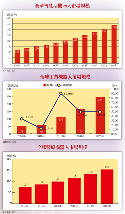 台廠零組件供應鏈 可望受惠營運大成長全球汽車製造產業各大車廠,最早自二十世紀中葉開始即將程式化機器人應用於點焊、塗膠、噴漆、液態物料填充、車體及內裝組裝等汽車裝配生產線作業。現為全球規模最大的電子組裝代工(EMS)大廠─鴻海,近幾年來為蘋果(Apple)代工組裝之智慧型手機、平板電腦生產裝配線,過去幾年展開的產線自動化,正逐漸加快調整、換裝速度跡象(鴻海已連續幾年成功併購多家自動化、機器人領域相關具競爭力廠商)。因此,預料在福特、通用、福斯、豐田等汽車產業生產工廠,以及全球EMS大廠鴻海的領先大規模應用、安裝自動化機器人上線量產之下,起到示範性作用,有機會帶動全球一波「自動化機械」安裝、應用風潮,也可望間接為台灣整體自動化機械相關廠商帶來長線營運發展成長契機。對於已經在高科技製造業領域累積豐富經驗、整體競爭實力領先全球其他國家的台灣業者來說,「產線自動化」應用風潮的日漸流行,浮現出一大片「利基藍海」,正等著台廠挾其深厚、獨到的應用及製造領先優勢攻城掠地。隨著未來「工業4.0」、「產線自動化」應用層面持續擴大,上下游零組件、整合控制系統等軟硬體供應鏈勢必有很大機會可以跟著吃香喝辣。「智慧自動化」產業發展方面,全球工業4.0進化風潮正雨後春筍、方興未艾地熱烈推展中,未來所將持續擴大之「自動化應用」風潮,形同為台灣智慧機械應用相關廠商提供源源不絕的發展沃土。根據工研院IEK經研中心市場及產業調查報告資料指出,預估全球智慧型機器人市場規模將於二○二一年大幅成長達三三七億美元。全球機器人產值 十年後達四.五兆美元伴隨包含賓士、BMW、福斯、豐田、福特等國際汽車大廠,與鴻海、仁寶、廣達、英業達等台灣大型製造業集團,以及新光保全、第一金、亞太電信等大型服務業者在內,相繼於製造工廠、產線,以及保全、接待等服務場所中,導入自動化機器人、服務型機器人的應用風潮日益擴散,預料全球後市「產線自動化」、「智慧機器人」應用風潮將會更形擴大。與工業機器人快速發展步調相較之下,全球服務型機器人目前發展可說仍位處起步階段,然而,其未來前景一點也不會落後工業機器人,預計未來全球服務型機器人整體市場規模將快速成長。預計到二○二五年底,全球機器人相關工業總產值將可成長達四.五兆美元,其中,二.六兆美元將為服務型機器人相關產業所貢獻,自動化控制系統產業市場規模屆時也將大幅成長達一六七四億美元。隨著全球工業機器人及服務機器人需求持續增加下,也將大幅增加對包含:機械構件、控制元件(模組)、操控軟體、感測元件、減速馬達、系統整合規劃等,自動化機器人應用相關軟硬體需求量,勢必也將大幅增加台廠供應鏈廠商需求,有助相關業者中長期發展。