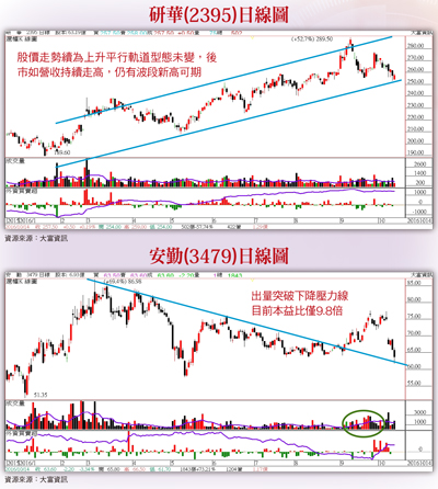 工業電腦龍頭大廠─ 研華(2395)一九九九年十二月掛牌上市研華,產品及營收比重為:嵌入式電腦卡四○.二三%、工業用電腦及其他二一.四四%、工業控制產品一四.三三%、應用電腦一二.○四%、售後服務及其他一一.九五%。產品銷售地區分別為:大中華三一%、北美市場二九%、歐洲一五%、亞洲一三%。研華公告九月營收為三十五.四三億元,月減一.○五%,年增一○.三一%;第三季營收達一○四.一一億元,寫下歷史次高紀錄,季減負二.八%,年增一○.三%;累計一~九月合併營收三一一.九七億元,年增一○.四四%。從區域市場別來看,研華九月營收以大中華、東北亞(日本、韓國為主)市場表現最突出。事業群方面,則以應用電腦事業群(ACG)、工業自動化事業群(IAG)、智能系統事業群(ISG)成長力道較強勁。以今年前三季各區域市場表現而言,東北亞地區營收成長最為亮眼,其次則為歐洲、大中華地區。事業群業績表現方面,以工業自動化事業群(IAG)、網路暨通訊設計製造服務事業群(NCG)最為突出。新事業領域發展方面,研華新近落成之林口二期園區,主要以物聯網為開發主題,預定於十月二十七~二十九日首度對外亮相,當日亦將攜手全球半導體IP(矽智財)開發大廠─ARM(安謀)共同策略結盟,一展雙方進軍全球物聯網、工業4.0市場高度決心。研華十多年前即前往中國市場開發,跟進美商惠普(HP)於中國各省扶植經銷商,同時進行售後服務的開發。現在,中國境內高達數千人的服務大軍,已成為研華於中國市場得以高枕無憂的重要主力。另一方面,研華產品的高度市場競爭力亦已相繼獲得指標性客戶肯定。美商機電系統整合暨家電產品製造大廠─奇異(GE)超音波、斷層掃描診療儀部分機種中,內部電路控制機板即由研華提供;以色列防空系統中最為關鍵之「Iron Dome」(鐵幕)反飛彈系統,可於短短數秒鐘內作出是否需攔截防空雷達網所偵測到空中不明飛行物重要決策,其中內建高速電腦軟硬體控制系統,同樣也來自研華產製。能夠成功打入高門檻、可靠度要求最嚴格高標的軍規、醫規市場,已成為研華技術能力成功跨入世界高水準一流殿堂最有力證明。相關「嵌入式板卡與機箱」產品線已成為研華現階段最主要營收來源,占比達四○%以上。展望後市營運前景,研華總經理表示,由於全球工業4.0應用趨勢已經成形,今年度於歐美、中國、東北亞地區市場需求強度依舊相當高,因此仍看好研華第四季後市營運表現,預料可望交出優於第三季佳績。另外,研華目前除持續前往日本、韓國開拓市場商機外,內部也已規畫、成立「工業4.0南進小組」,希望能夠成功將於台灣、中國市場多年來推動工業4.0的豐富經驗,完整複製至越南、新加坡、馬來西亞、印尼等東南亞區域市場。法人預估,研華今年全年營收約達四二一.一五億元,年增近一○.八三%左右,全年EPS約九.一元。推估明(二○一七)年營收年增率約一○.二%,全年營收可持續成長達四六四.一億元,EPS持續走升達約一○.三四元,目前本益比約二四.九倍。工業電腦產銷專業廠─ 安勤(3479)成立於二○○○年七月的安勤,於二○一○年六月掛牌上市,旗下產品及營收比重為:工業用主機板六○%、嵌入式系統電腦三五.九○%、其他四.一一%。產品主要應用於:教育娛樂、工業控制、車載電腦、醫療、互動多媒體機台、博弈等領域。產品銷售地區為:外銷占比九五%、內銷占五%;其中,美洲市場占六五%、歐洲一五%、亞洲一五%。安勤公告九月營收為二.九一億元,月減三八.五%,年減三七%;累計一~九月合併營收達三九.五億元,年增二七.八七%。由於美國POS市場成長動能第二季較強,第三季出現趨緩現象,加上其他進行中專案營收亦同時進入淡季市況,僅有先前與仁寶(2324)集團合作的「開放式平板」獲美國二線健身器材客戶下單加持,安勤第三季營收預估僅一一.九七億元,季減一一.四六%,年減一.八九%;但第四季將迎來美國投票機、博弈機台與日本強固平板電腦出貨旺季,加上在手美國安控專案也要力拚年底前順利出貨,法人預估第四季營收將可順利回升至十三億元以上,有望達十三.二億元水準。