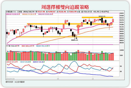 美股進入財報週後,指數波動也受到各股公布營收影響,形成上下震盪的走勢,然而波動幅度依舊未能脫離九月份的整理區間,由於美國總統大選已進入倒數階段,這個被標榜為二○一六年最大的黑天鵝事件即將登場,因此近期市場態度顯得較為謹慎,整體觀望氣氛濃厚。台股近期受到新台幣貶值影響,造成投資人對外資離場的恐慌加劇,OTC領先大盤跌破年線,週一大盤也跟進上演了季線保衛戰,現階段台股面臨最大的壓力,便是資金行情所帶來的派對何時會結束,而主導權仍掌握在外資手中,歷年台股第四季的消費電子旺季行情,也將隨著外資的去留而成為未知數,因此,近期需特別留意外資在期貨倉位的調整狀況,以及美元兌新台幣匯率,一旦出現期貨連續減碼且新台幣貶值的現象,操作便應轉向保守。台指期外資十九日的未平倉淨多單為八萬三千九百六十九口,自營商在選擇權部位轉為偏多布局,在十月份台指期拉高結算之後,法人依舊維持偏多立場,目前指數再度來到九千三百點的關鍵價位前,可佈局突破(買方勒式或跨式)策略。