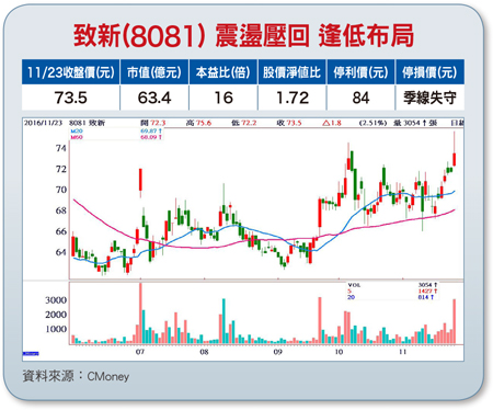 致新(8081)是類比IC大廠,主要產品有電源管理IC、溫度偵測IC及音頻運算放大器,產品應用營收比重依序為面板業佔三一%、筆電佔二三%、代理商銷售佔一九%、LCD電視與監視器佔一三%、其他佔一四%。第四季原本為傳統淡季,但是受惠歐美銷售旺季到來,以及客戶農曆年前備貨需求提前拉貨,包括筆記型電腦與面板市場需求皆轉趨熱絡,加上資料中心所需的伺服器不斷增加,致新第四季將淡季不淡。展望第四季營運,營收預估將季減四%到季增四%之間,不過,仍然遠優於過去季減約一成的情況,毛利率則會落在三二%至三六%之間,優於第三季的可能性相當高。致新的快速充電IC已於去(二○一五)年搭配行動電源產品出貨,今(二○一六)年則在手機市場推出光學防手震(OIS)解決方案,目前音圈馬達(VCM)驅動晶片已經量產出貨,終端客戶為智慧型手機品牌廠,OIS產品也將於今年底開出,根據研調機構預估,明(二○一七)年整體智慧型手機雙鏡頭滲透率可望攀高至一六%,隨著手機搭載雙鏡頭趨勢的風潮,致新將直接受惠。除VCM出貨持續成長外,致新明年面板市占率將持續擴增,固態硬碟(SSD)用電源管理晶片產品也將挹注業績,將可帶動致新明年營收重返四十億元大關,每股純益也將挑戰六元水準。