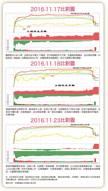 本周一(十一月二十一日)台股早盤先小回二十二點,但能量出現多方喇叭嘴,五檔張依然偏多,九點三十分後連續拉抬十個五分鐘盤,多方企圖心十分強烈,雖受限於短線壓力,僅收小紅,但以能量與盤中多方展現的企圖心來看,九○六七的短壓應可越過,朝月線甚至季線前進。周二(十一月二十二日)外有美股四大指數同創歷史新高的激勵,內有政府願意考慮降稅的利多,台股開高走高,帶量拉抬,一度大漲一二○點攻上季線,收盤仍以中紅九十二點站穩月線,且外資果如預期轉為買超。可惜收盤能量買訊消失,雖有挑戰九二○○點的機會,但九二○○點之上,應是短賣點。美股續創歷史新高,十一月二十三日台股開一高過高盤,多方能量強勁,九點三十五分後出現遞增量拉抬,一度站上九二○○點大關。但空方能量上升,五檔張翻空,均張負值擴大,故留上影線收小紅。收盤能量為短線賣訊,表示大盤隨時會見高回檔。過去一周的走勢,證明了能量的看法正確。也就是美國大選之後,我在所有媒體強調的,台股未來一個月加權指數將進入四百點左右的區間震盪,也就是八八○○~八九○○點是支撐買點,九二○○~九三○○點是壓力賣點,就算在十二月美國Fed升息前後,有突然摜破八八○○點,也很可能就是另一次波段絕佳買點。然而,個股多空大不同,空方股反彈到壓力要找賣點,多方股回測支撐要找買點。位於低檔的生技股,出現底部四手紅盤,可多加留意。