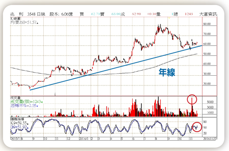 兆利(3548)為樞紐大廠,今年MIM技術(金屬粉末射出成型)良率拉高達五成以上,也順利打入蘋果供應鏈,果然今年是兆利大爆發的一年。兆利一○四年營收三八.七億,今年前十個月四六.三億,年增五○%,同時毛利率由去年首季一八.三%,拉高到今年第三季二六%,更是提高獲利的原因,第三季EPS二.五五元,累計前三季EPS高達六.三八元,已較去年全年三.九元大幅超越,今年全年有達八元以上機會,挑戰九十六年上市時EPS八.四八元的輝煌成績,當年股價最高點一九八元,和十一月二十二日收盤六二.九元還有很大差距,今年營運是九年來最好的一年。兆利今年股價一度漲到八一.四元,第三季出現回檔,加上公司辦理現金增資,認購價六十元,股價一度跌到五十五元,跌破承銷價,直到第三季財報發布後才回穩。若今年EPS八元以十一月二十二日收盤六二.九元計算,本益比僅七.八倍,和高獲利公司比較,還相當低,股價具長線投資價值。以線型分析,八月八一.四元時年線於三九.七元差距太遠,但目前年線五一.六元和股價接近,有機會再度啟動一次新的多頭。日線KD近日正好完成黃金交叉(五十九、五十二),中線多頭也正產生中。十一月八日成交量七三二五張,高點六六.五元突破便是加速時。