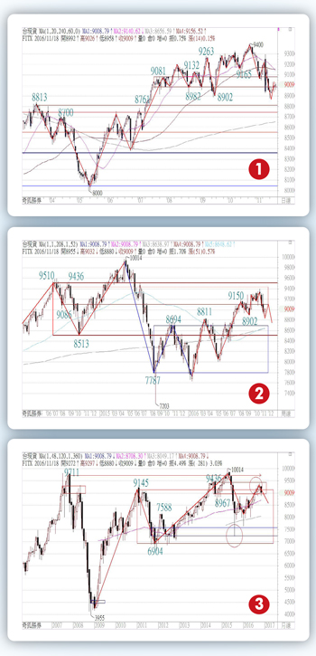 不如好好看「其學員」是否真的天天或經常都在賺錢比較重要吧!若學生都能賺錢,這才代表老師沒有藏私,這才代表老師的方法真的適用大部分的投資人唷!會賺錢當然是可喜可賀,但是用多少資金賺到一百萬,花多久時間和多大的風險,也是要考慮進去的。投資者應該找出適合自己的方法,不要看到大賺幾百萬大賺幾千萬就去羨慕與幻想自己也行。打個比方,讓您一個月下一千口大台賺一百萬,這績效如何?那也可能會賠一百萬啊!是的,但是您停損不夠快,可能來不及五點,也就是賠的時候可能不只一百萬唷!再者,至少您要有幾百萬,您才敢沖這麼多口吧!一、一般投資人沒有這麼多資金可以操作期貨的。二、而且能一個月下一千口以上的人也不多見,除了用極短線的方法那一派,還會有幾位敢這樣下。三、平均只賺五點何必冒這麼大風險又這麼辛苦。四、身體會負荷不了,比如眼睛和手腕等部位,也就是他可以下一千口賺百萬以上這個方法,並不適合大部分的投資者。若一套操盤系統是合乎所有商品的股價波動邏輯,則只要做好盤前規劃,知道正常與異常的關鍵處,就不需要利用盤感去修正盤中,而且幾乎可以高勝率的預測與推演後面的短中長脈動的走勢,這就是「箱波均控盤戰法」能做到的事情,故曰:大道至簡心神怡,箱波均法寶9-11,軋空殺多之前兆,大漲大跌一把罩,以逸待勞不費事,猶似倚天屠龍出,誰與爭鋒任運行。提醒各位:要成為超級賽亞人之前,不如先穩定持續每個月都能利用一口期指賺到三百點為目標,千萬不要好高騖遠,成功是慢慢累積的。我們來看台現貨的日線圖,由於一次破九○八一到八九○二,因此反彈需留意破而不過九○八一到九一三二則還要再往下測試底部的,再者,圖中的二十日均線和六十日均線出現死亡交叉的訊號,因此反彈不過留意有往下測試年線ma240的機會。再來看台現貨的周線圖,由於次箱頂九四三六不過,所以會往下測試九○八六,由於八九○二被測試因此留意若反彈不過九○八六則有機會往八八一一到八六九四測試。再從台現貨的月線圖來看,上漲次箱頂九四三六不過就會往下測試上漲次箱底八九六七,目前的趨勢動力在八七四五到八三七八,還沒有跌破前,還有再往上做一次止漲缺口的機會,但是需留意縱使往上拉抬是給我們逃命減碼,不是再度進場的。