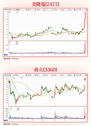 美股主要指數近期因受惠基本面經濟數據統計報告表現良好,以及市場對新總統新政利多預期心理推升下,接連創歷史新高、十餘年來新高點,市場普遍一片多方控盤、歡喜作多氣氛;台股市場短線也因為受惠美股衝高激勵效應,指數接連漲升不停、差點成功收得十根紅K棒!短短十一個交易日,大盤指數最多一度大漲三六二點、四.○八%漲幅;上市櫃個股近期也同時見到因重獲市場資金動能挹注、主力關愛眼神青睞,盤面多檔中小型個股輪動大漲熱鬧漲勢,台股短線多方控盤、偏多型態目前仍未有變。財報營收實績表現亮眼、產業基本面前景展望透明度拉高、營收成長動能增強,外資、投信爭搶卡位、市場籌碼穩定度拉高,股價有機會上演波段漲勢鏢股有:聯昌(2431)、美隆電(2477)、尚立(3360)等個股。無線充電利多加持 聯昌股價突破半年線反壓聯昌(2431)-聯昌目前持續供應韓系家電及行動電子裝置大廠LG電源供應器重要零組件,公司先前亦曾自創otta品牌生產無線充電器出貨。公司主要業務為相關家電電源應用產品,營收獲利表現穩定,預估今年全年EPS約一元水準左右。市場普遍預期,蘋果將於明年推出之十週年紀念重要機種i8中導入無線充電功能,使得聯昌近期因受惠市場預期,無線充電應用題材面利多加持效應,股價因而順利直奔達一四.二元價位,強勢一舉突破上檔半年線反壓大關。受惠宏達電、三星、LG等智慧型手機大廠,相繼開始推出搭載無線充電功能新機問市後,伴隨充電傳率功率的持續提升、速度加快,使得全球無線充電市場滲透率正不斷快速提升中。截至目前為止,不僅蘋果亦有意進一步加入全球無線充電市場商機大戰,包括:中國中興、OPPO等智慧型手機廠,亦計畫相繼於明年持續擴大具無線充電功能新機出貨量,明年可望直接受惠應用面持續擴大市場商機。