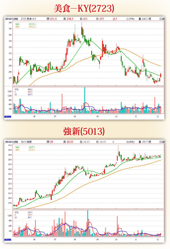 美食-KY、強新、鉅橡 法人捧場連續買超美食-KY(2723)中國地區受惠中央廚房整併效益與營改增帶動,第三季毛利率及營益率均明顯跳升,獲利表現也創歷史新高。而明年的展店計畫明確,獲利能力也將受惠規模經濟再提升。先前受到盤勢氣氛不佳使得股價出現二個月的修正,但法人籌碼並未鬆動,且在接近年線時投信亦連續買超超過八個營業日,在盤勢走穩的同時股價可望回升。強新(5013)主要營業項目為線材產品項目,涵蓋碳鋼、不鏽鋼及合金鋼材質;另一主要產品超潔淨拋光不鏽鋼管(EP),EP管主要應用於半導體無塵室、面板、生化、石化業、太陽能之建廠需求。強新第三季獲利○.七四元創下單季新高,而EP管將持續受惠中國扶植面板、半導體產業趨勢,與公司切入汽車、航太、精密機械的螺絲市場,帶旺兩岸伸線產品持續成長。二○一七年訂單幾乎已確定,受惠台積電、南科在台灣先進製程的擴產與中國官方扶植半導體產業、面板廠擴建之產能需求,EP管需求暢旺,年底將完成EP管的擴產,擴產後預估明年產值可較今年成長二成,外資亦於十一月出現連續買超,亦看好其未來營運成長動能。鉅橡(8074)為國內最大PCB鑽孔墊板廠,新產品美耐板於本季開始放量出貨,目前美耐板在台灣仍屬寡占市場,鉅橡藉由在電木板製造經驗跨入美耐板市場,預期隨技術經驗提高將逐步拓展市占,明年美耐板事業可望明顯貢獻獲利。外資已連續買超十七個交易日,股價走勢升溫可期。