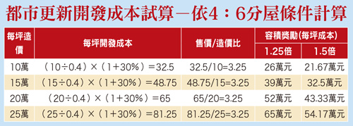 其次,在「房產重稅難解,都更窒礙難行」之疑慮下,對於主管機關所提出仍是以目前稅基(調整後的地價和現值)為基準的方案,縱是首次移轉前永久減半,都更後地價稅和房屋稅的負擔,都還是以倍數計,政策結果如何,可想而知;以台北市政府從一○三年七月一日起以「一刀切」方式大幅調高房屋稅為例,不論是其後完工的新成屋乃至於未來的都更宅,同樣都會面臨沈重的持有稅負擔。都市更新的推動,加上關聯性產業的經濟效益,確實可以創造相當可觀的經濟產值,更是當前極為重要的內需經濟動能,惟現階段景氣逆轉,今年交易量可能創二十五年新低,房仲業者票選一○五年房市代表字,「苦」、「冷」兩字分別雀屏中選,實已貼切地反映今年買賣雙方及不動產業者苦悶的心聲,以及價量齊跌的現況;而當前推動都更最值得關注的應是,景氣好壞與房價高低才是決定都更是否可行之主要關鍵。都更過程複雜 無法一言以蔽之最近政府一再以容積獎勵做為推動都更誘因,殊不知動輒長達七到八年的都更流程,基本上應以動態觀點制定政策,而非靜態。就附表一所列公式,以RC結構每坪造價十萬元估算,實施者與地主如以四:六分配比例分算,在無容積獎勵情況下,房價得超過三十二.五萬元方才具備可行條件,也唯有實施者有利可圖,都更才可順利推動;因此,在當前房價預期下跌,每坪三十萬元以下的區域就會面臨很大的阻礙。另外,如就增加容積獎勵誘因加以探討,就台北市目前通過審議個案,容積獎勵大都僅介於二五%~三五%之間,因此,如就三十二.五萬元除以(一+二五%)=二十六萬元,三十二.五萬元除以(一+三五%)=二十四.○七萬元,倘若容積獎勵可以高達都市更新條例母法上限之五○%,亦即三十二.五萬元除以(一+五○%)=二十一.六七萬元,因此,除非逾越法令規定,否則中南部每坪房價三十萬元以下地區就很難推動,因此,在都更客觀條件「變、變、變」之錯綜複雜過程,必然無法一言以蔽之,甚至擬以簡單的計算公式輕言大量推動。