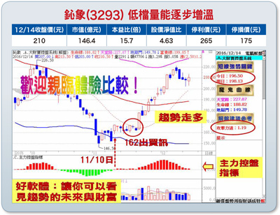 第一季「發發發」博弈遊戲進軍中國大陸,第二季再推出賓果、百家樂、德州撲克等。此外,中國大陸自二○一五年七月起對電子遊樂場法規鬆綁,未來換機潮有助鈊象出貨量提升。主要利基題材有:(1)旺季來臨,營收月月高:受惠招牌大作《三國戰紀》PS4版十二月推出新的改版內容與好康活動,以及商用機台出貨穩定成長,訂單能見度明顯提升,推動十一月營收攀上二.九三億元近四個月以來新高,月增一五.六四%,年增五四.五四.一%,累計前十一月營收三十.五八億元,年增七九.一三%,預估十二月營收可望續增,獲利可望同步上揚,單季獲利可望再寫歷史新高,前三季EPS達九.七元,已大幅超越去年全年獲利四.四元,站穩遊戲股股王地位。(2)營運重回成長軌道,明年營運持續看俏:除了與Aristocraft共同開發的《發發發老虎機》遊戲已在兩大平台Google Play及Apple iOS上架,將對鈊象營運帶來莫大獲利挹注外,近年來隨著各國法規陸續鬆綁,推升商用機台換機潮湧現,有助鈊象迎接換機潮大單,業績可望一路長紅,甚至法人預估明年EPS將有挑戰兩個股本機會,不過,一切仍以公司發布之實際狀況為主。配合券資比攀升,似乎可望再啟動一波軋空行情(※基本面資料若有異動,依公開資訊觀測站最新訊息為主)。個股推薦:低接不追高,守穩一七五元關卡不破,逢低於富貴線至生命線附近仍可留意,預計初步反彈目標可望續戰前高二七○元頸線壓力區,設好停損停利(詳見附圖說明)。