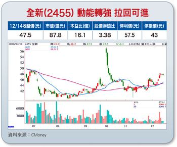 操作建議:全新股價於減資後拉回至四十元止跌,後續在四十四元以下打底一個月,近期成交量放大且股價有向上突圍姿態,若能站穩四十六.五元頸線支撐,則中多結構正式成形。