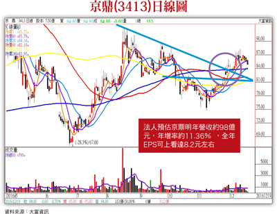 台積電、日月光、矽品拉貨 弘塑後市成長動能強勁台灣半導體封測設備大廠─弘塑(3131),公布十一月營收為二.四億,月增率為二二.○二%,年增率達三二.五三%;累計今年一~十一月合併營收總額達二○.一億元,年增率為一九.四八%。展望後市營運成長動能,主要倚賴半導體大廠「先進封裝InFO(整合扇出型晶圓級封裝)製程」設備二度下單挹注力道,將成為包含弘塑在內半導體設備廠明年營收能否再度高飛重要關鍵。儘管弘塑第三季營運成績單表現不甚理想,但由於台積電(2330)龍潭封測廠設備採購訂單,於今年第四季才陸續入帳。也因為如此,弘塑今年整體營運表現將會「先蹲後跳」。產業界人士預期傳出,弘塑今年第四季單季獲利有望賺得六元以上,季增率高達驚人的一一四%。今年全年EPS也將因此達標十六元以上,與去年水準相去不遠。台積電龍潭廠為其IC晶圓代工製造後段封測製程重要基地,今年以來即陸續大舉建置高階InFO產線,目前第一階段產線已全數就位,當中有不少濕製程設備即是由弘塑所出貨供應,同時亦自九月份開始認列、入帳。同時,台積電龍潭廠明年亦規劃將持續擴充產線規模,後市所將帶來的設備採購訂單量成長力道,更令人期待。 全球晶圓代工業龍頭大廠─台積電,目前可說是包下全球半導體產業圈大半比例之採購及設備支出。高階先進製程─一○奈米須得要趕在年底順利量產,以成功卡位蘋果下一世代處理器晶片「A11」代工訂單。A11晶片將於近期完成設計定案(Tape-Out),預定於明年第二季開始,採用台積電一○奈米投片量產供貨,並將持續延續一六奈米製程使用先進封裝InFO出貨。因此,第二批InFO訂單,市場法人預估將會於第四季至明年第一季到位。台灣幾家半導體IC製程後段封測設備廠商,先前因「日矽戀」糾纏許久,造成各家業者苦等訂單未及到手,因而拖累營運表現。今年則主要倚賴台積電投入IC製程後段先進封裝領域,下訂、拉貨多台「先進封裝InFO(整合扇出型晶圓級封裝)製程」封裝設備,廠商營收業績表現才見起色。尤其台積電於成功奪下蘋果手機核心處理器較大比例代工份額後,預期下一代「A11」處理器量產主流製程─一○奈米,也將沿用更高階、更高效能「InFO」先進封裝技術;如此一來,一○奈米預定於明年第二季正式量產期前後,也將成為相關設備廠商後續接單、設備驗收的關鍵重要時點,也因此得以讓設備廠今年下半年驗收旺季效應,成功延續至明年上半年。國內設備業者評估指出,如果全球半導體IC封測產業大事「日矽戀」可順利於明年底過關,預料後續新下訂封測設備機台訂單拉貨需求,最快即可於明年上半年度浮現,台廠相關供應鏈業者近期無不拉緊營運神經積極備戰,其他封測業者如:力成(6239)等,也將同時加速SiP(系統級封裝)升級產能需求,同樣將對封測設備廠未來訂單成長挹注強力成長推升動能。集團拉貨支持效應持續增強 京鼎未來營運表現大有看頭市場法人預估,弘塑明年全年營收仍有機會維持二位數以上成長率,上看二十五億元水準,全年EPS將強勢挑戰二十元大關。全球最大電子代工(EMS)廠─鴻海(2317)集團旗下「半導體設備」廠─京鼎(3413),於二○○一年成立,主要業務為半導體製程設備、自動化設備、模組及零組件之研發、製造、銷售。現階段營收分項結構占比中,半導體設備占整體營收比重約六八%、自動化設備及系統整合約占比三二%。目前最大客戶為美系半導體設備大廠─應用材料(Applied Material)代工業務,約佔整體營收比重達六○%以上,第二大客戶即為泛鴻海(2317)集團往來業務,約占比二○%左右。京鼎公告十一月營收達七.○二億元,月增率為一一.二五%,年增率則為二○.二二%。累計今年一~十一月合併營收總額將達七○.四一億元,與去年同期相比,高達四八.五三%。有關第四季及後續營運成果表現方面,因京鼎半導體設備代工接單美商應用材料市況持續熱絡,法人推估單季營收儘管將小幅低於第三季旺季水準,季減約個位數百分比幅度,惟仍為高檔水準未變,今年營收亦將因此再次寫下歷史新高紀錄,獲利表現也有機會續創新高,優於去年水準。法人機構推估京鼎今年全年營收年增率可達二○%以上,惟因受毛利率下滑(面板自動化設備毛利相對較低)、稅率提升影響,獲利表現為持平水準。如以增資後股本七.五億元推算,今年年度EPS預估將低於去年八.一一元水準。法人預估京鼎明年營收約九八億元,年增率約一一.三六%,全年EPS可上看八.二元。與日本TFT-LCD大廠合作 均豪營運將如虎添翼台灣半導體及面板製程設備專業廠均豪(5443),於一九七八年成立,以自有品牌「GPM」經營設備製造、銷售、服務為主。公司成立初期,首先以半導體設備相關應用模具零組件製造為主力業務。自一九八五年開始,逐步跨足自動化設備、製程設備、精密模具零組件營運領域。目前公司整體分項營收結構方面,面板製程相關設備約占比達六○%比重,半導體製程設備則占約三○%比例,其餘為其他項(包含智能自動化設備等)業務。均豪公告十一月營收二.九五億元,月增率二八.七三億元,年增率為負一五.一七%;今年一~十一月營收總額達三三.○九億元,年增率負一.五九%。均豪第四季營運成果而言,由於拉貨需求最主要來源為中國面板廠,目前出貨狀況表現佳,預計第四季營收有望較第三季回溫。目前均豪整體接單狀況佳,在手訂單能見度已達