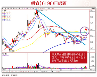 兩岸半導體、面板廠擴廠大潮 帆宣喜迎黃金三年隨著台灣及中國多家半導體、液晶&OLED面板大廠持續積極擴產(廠)下,有利台灣工程暨設備大廠─帆宣(6196)後續順利接獲大單、推升營運成長。帆宣總經理指出,年底向來即為傳統營運入帳高峰期,一旦能夠順利按照先前預定工程建設、設備機台驗收進度結案,今年公司營運確定將收獲一個圓滿好年。展望明年營運前景,根據目前所掌握來自客戶端營運分析&預測計劃,明年營運仍將有助帆宣進一步升溫、成長。帆宣旗下業務主要分為兩大部分,第一項由帆宣自行接單之設備代工及工程業務,近幾年來主力往來客戶向來以半導體、兩岸面板廠為主。另一方面,為國際半導體設備品牌大廠代工之間接接單業務,則可以發揮成功避開來自產業景氣循環起伏波動,所造成負面影響保護效益,同樣有助公司營收及獲利穩定表現。全球晶圓代工龍頭廠─台積電仍持續擴大資本支出,規劃於中國大陸南京興建之十二吋晶圓廠預計於明年底前完工上線,後(二○一八)年下半年開始,預計先以十六奈米製程為客戶投片量產。根據台積電所公告資料內容,南京十二吋晶圓廠總金額約一六.八五億元之廠務設備工程已全數發包完畢,帆宣、漢唐等台廠業者已順利拿下服務訂單,將可為公司挹注明年營運強勢成長動能。面板設備市場 未來可望持續走揚就面板產業而言,儘管台灣面板廠建廠進度現階段已正式告一段落,但明年中國大陸卻還有多座面板廠將接續啟動建廠作業。產業市調機構先前即看好面板設備市場,今年有望大幅成長達近九○%產值年增率,明年則仍可望續揚走高,面板相關生產設備業者已成功進入有利營運「黃金三年」。帆宣公告十一月營收達一八.四億元,月增率高達二六.四三%,年增率七.四%;累計今年一~十一月合併營收總額達一六七.○九億元,年增率為一.二一%。帆宣表示,目前在手廠務設備工程訂單量續達百億元以上,依舊維持高檔水位未降,預料明年工程設計&系統應用事業群營收占比仍將續維六○%以上。今年營運表現最佳為「OEM/ODM研發製造事業群」,主要因受惠今年半導體、面板廠相關客戶設備及工程訂單需求成長力道強勁;尤其,半導體廠客戶持續釋出建廠服務需求,因此在手訂單能見度已長達明年,遠優於以往平均三個月水準。法人機構預估,帆宣今年全年營收可望交出一○.五%左右年增率佳績,達近二百億元大關;同時,受惠產品業務營收組合轉佳下,單季毛利率有望站穩一二%水準,全年EPS有機會突破二.五元關卡,達二.七九元。明年全年營收則有望進一步成長一二.五%年增率,達二二三.三億元,年度EPS預估有機會進一步成長達三.三七元。
