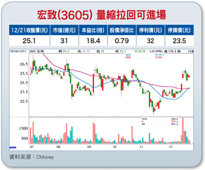 宏致(3605)是專業連接器廠,也是國內少數具備筆記型電腦繪圖卡連接器、硬碟連接器以及各類卡類連接器等多樣化產品線生產技術的廠商,主要產品為板對板、線對板、軟性電路板、記憶卡連接器、電池連接器等;營業比重為連接器八六%、連接線組一○%、其他四%。宏致近年積極進行轉型,逐步提高非筆電的貢獻,去(二○一五)年正式併入線束廠龍翰,並投資南通大地股權,取得業務合作開發的機會,雙方共同開發電動車的零件(宏致交貨連接器),現已導入南通車廠客戶,合作開發的新車種預計明(二○一七)年上市。公司今(二○一六)年是以美國及大陸市場為重點,提供包括消費電子周邊、手持式裝置、汽車電子、雲端伺服器、工業等連接器及連接線產品,加強對目標客戶的滲透率及深化產業發展,由過去產銷公司轉變為連接器解決方案提供者,提供更高附加價值的產品與服務。宏致第三季營收十四.一六億元,較第二季十二.二七億元成長一五%,創下新高,十一月營收也繳出好成績,不僅較十月四.五四億元增加四.九%,也比去年同月成長了三.八%,預估第四季整體營運在中國農曆年節前的拉貨力道挹注下,可望淡季不淡,而明年在與南通大地的整合效益發揮下,成長潛力值得期待。