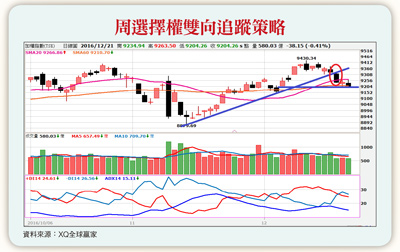 十二月的FOMC會議確定升息之後,ICE美元指數持續走高,而美股四大指數也持續創新高,其中道瓊指數更是距離兩萬點僅一步之遙。今年交易日已經所剩無幾,在年底的作帳行情帶動下,市場趨勢將利用川普的經濟擴張政策題材,再加上美國聯準會(Fed)對明(二○一七)年基準利率的預期,也超過市場的估值,顯示美國經濟增長將持續被看好,在此同時,市場資金也會持續流向美元資產。回過頭來看台股,加權指數自週一(十二月十九日)跌破短期密集區的支撐之後,大盤開始回測十二月六日的多方缺口九二○○點,由於本周即將進入歐美長假,因此,外資圈進場意願降低,台股成交量能也持續呈現萎縮的現象,可以看到本週台股成交量都是低於五日均量,顯示市場整體交易極為清淡,大盤預期將在九二○○至九二五○點進行區間弱勢整理。十二月二十一日的台指期壓低結算,外資的未平倉淨多單滑落至五萬八○九一口,自營商選擇權部位則轉為中性立場,顯示法人態度在年底期間轉為保守操作。近期大盤波動偏低,市場交易清淡,可以溫跌作莊(買權空頭價差)策略來操作。